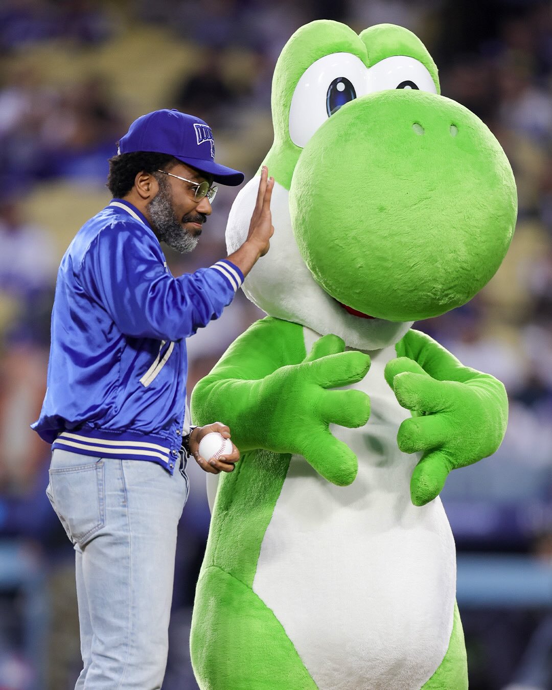 Actor Donald Glover threw the first pitch at the Dodgers game to Yoshinobu Yamamoto on “Yoshi” bobblehead night ⚾