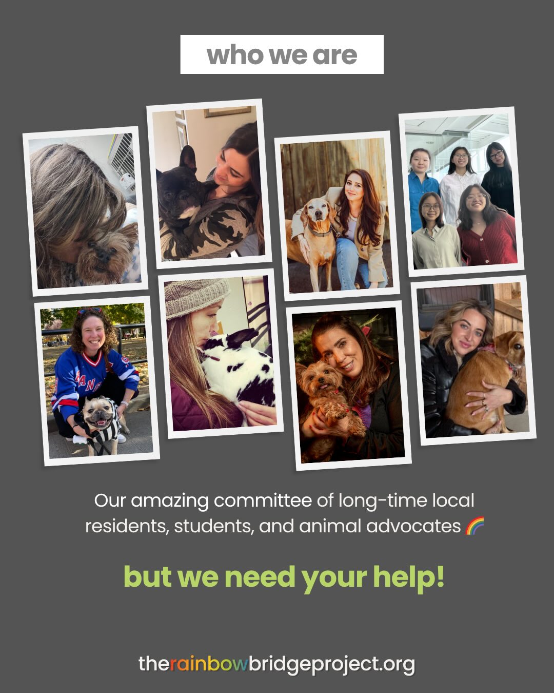 If you feel connected to our mission, we welcome contributions via our Go Fund Me which can be found at TheRainbowBridgeProject.org.