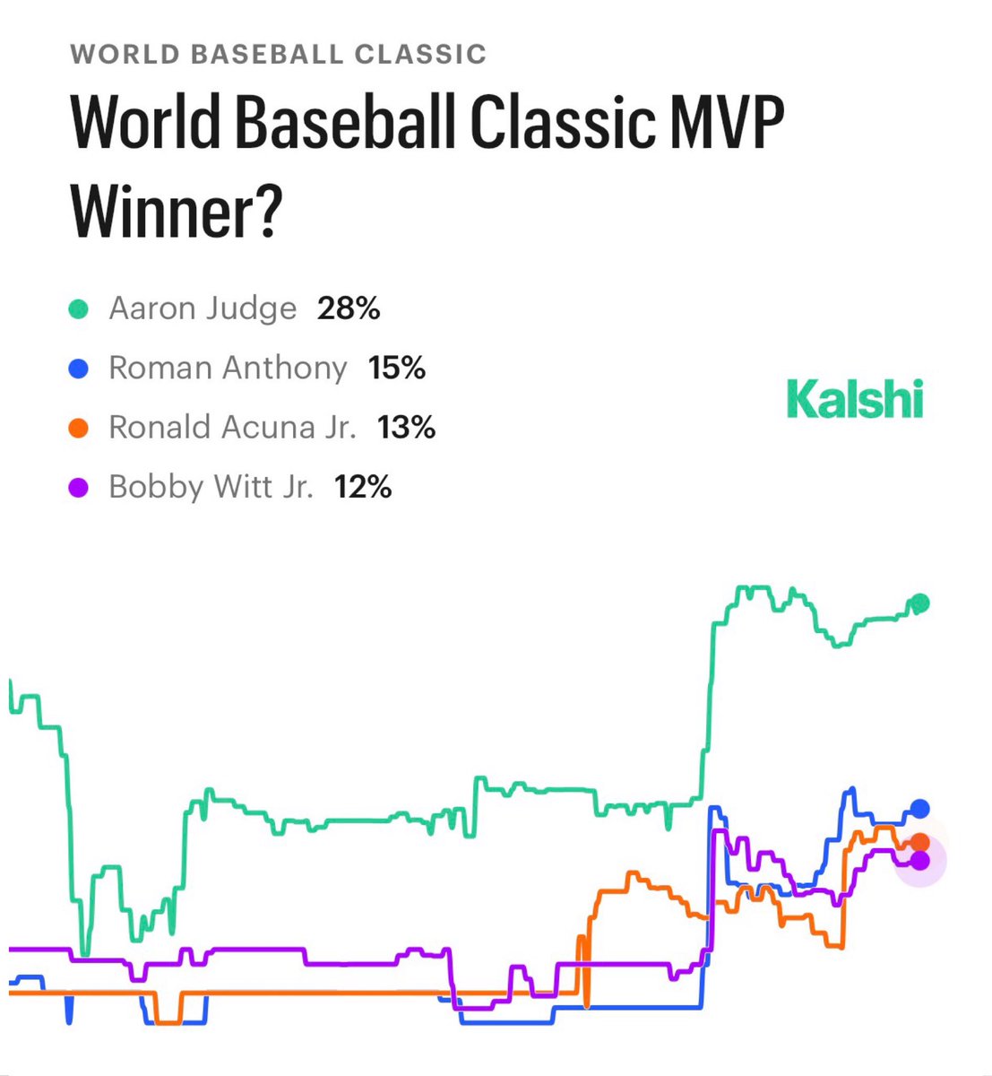 Favorites to win WBC MVP, via Kalshi: 28% — Aaron Judge 15% — Roman Anthony 13% — Ronald Acuna Jr. 12% — Bobby Witt Jr. 9% — Kyle Schwarber Create a perfect March Madness Bracket for 1B: t.co/uwwmbmV1Fk