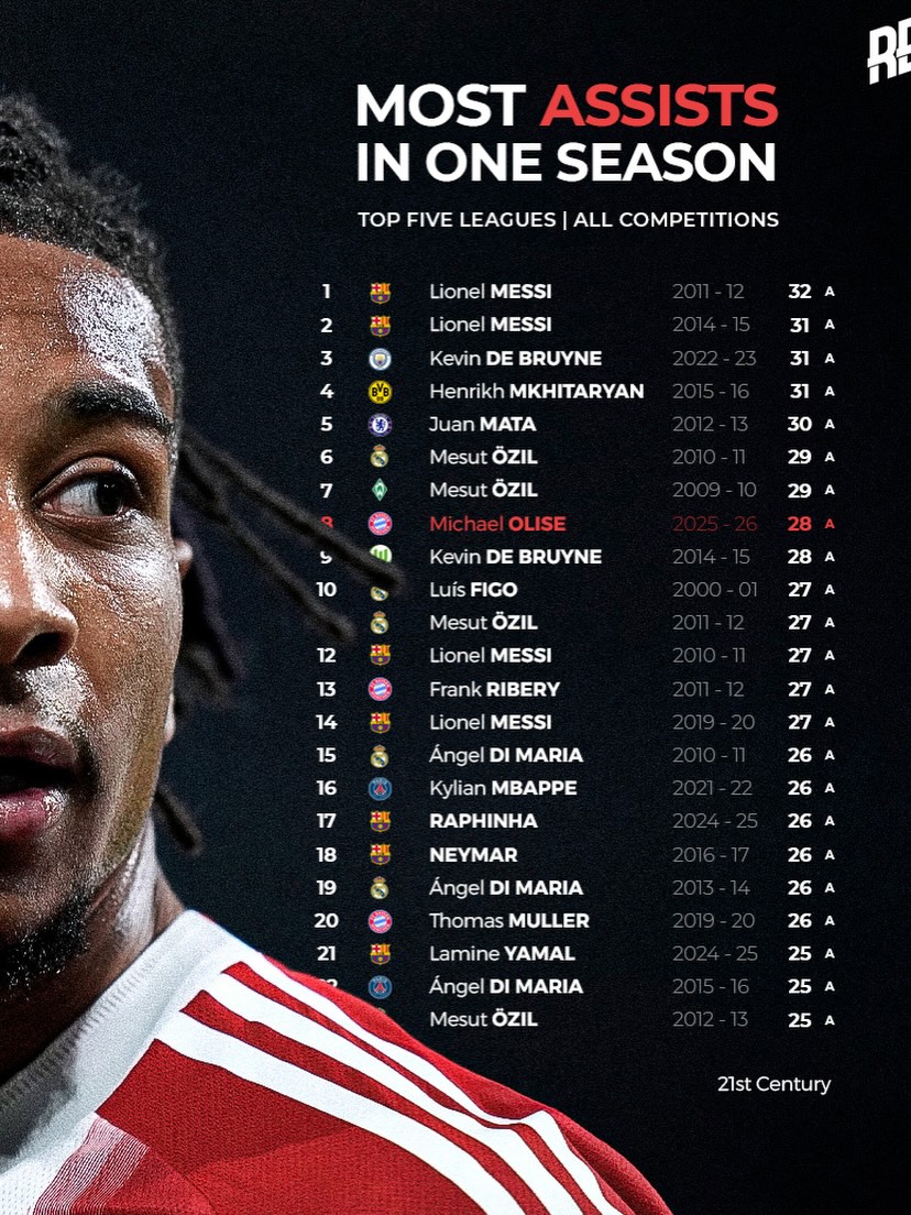 Olise has bagged 28 assists and is 4 away from matching Messi’s record having played 20 games fewer 🤯