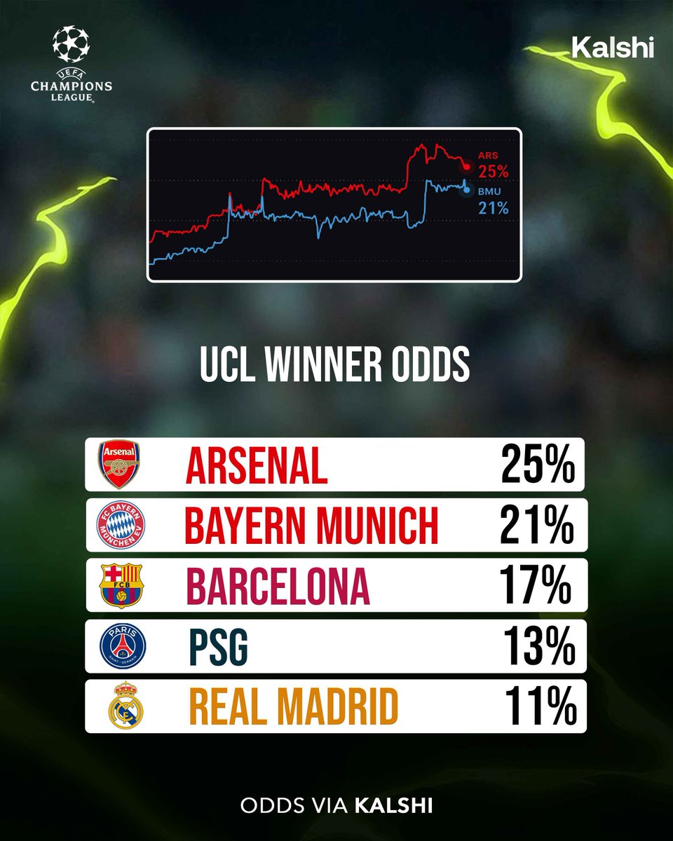 🚨 Despite losing the FA Cup and Carabao Cup Arsenal are still heavy favorites to win the 2026 champions league.