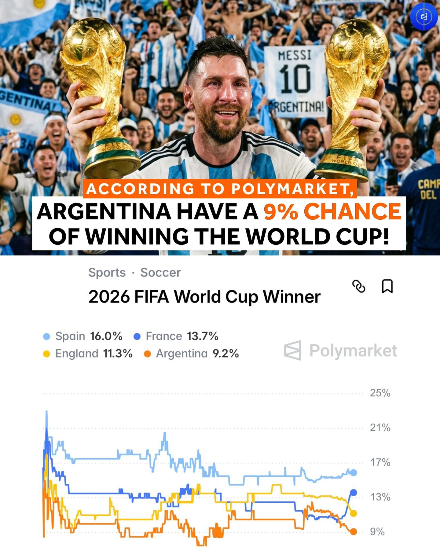 They will be hoping to lift the World Cup again this summer, & according to @PolyMarket, they have a 9.2% chance of doing that! 🏆