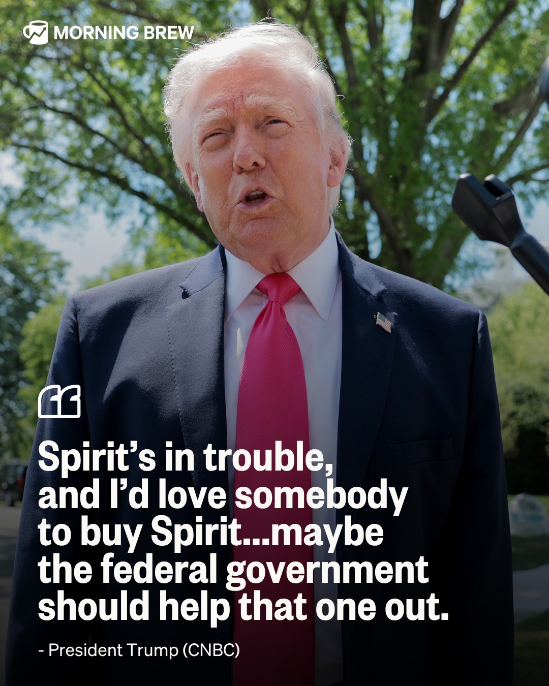 Speaking with CNBC this morning, President Trump remarked that he'd "love somebody to buy Spirit,” adding that “maybe” the federal government should help out the ailing airline. It’s stock price more than doubled during trading following the presidential sound byte.