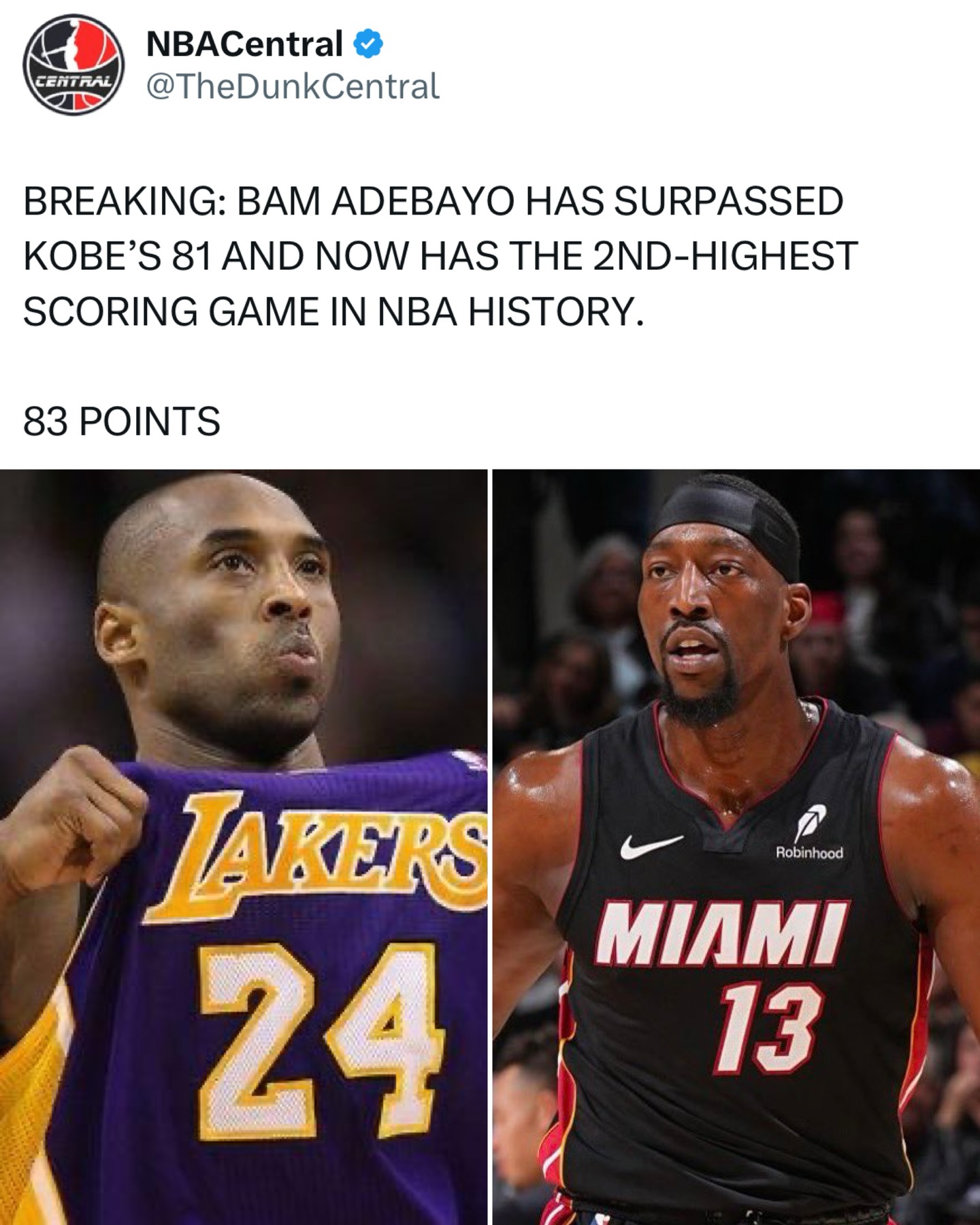 Bam Adebayo just scored 83 POINTS to surpass Kobe Bryant for the 2nd-most points in a single game.