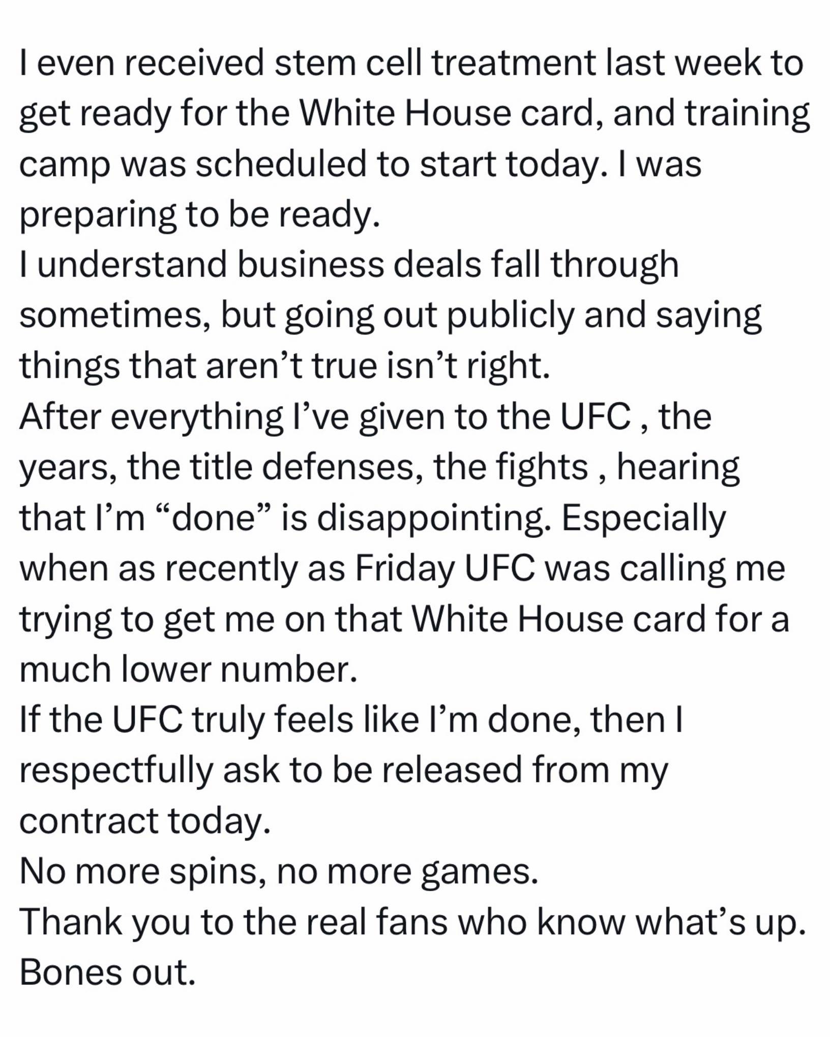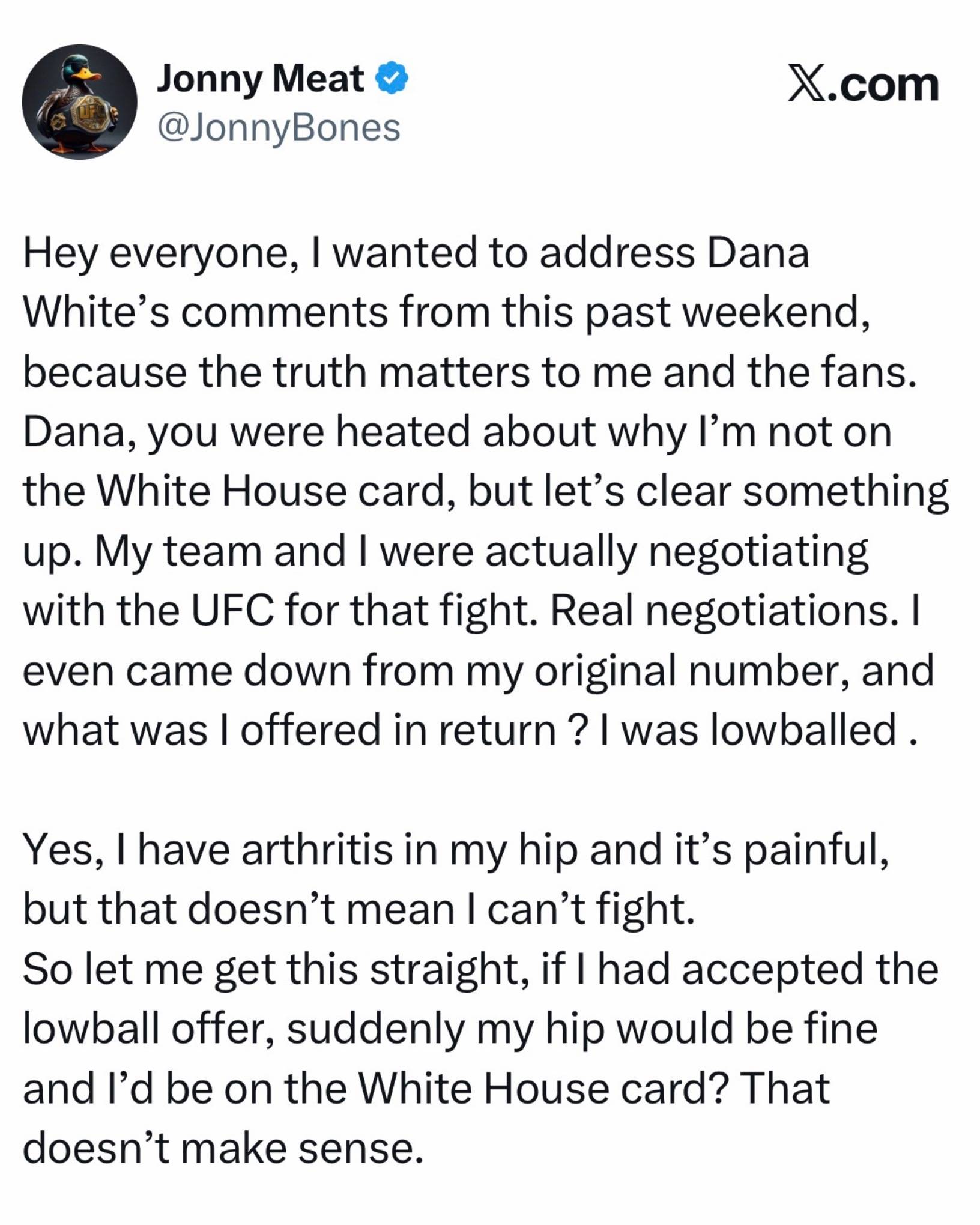 Jon Jones took to X to address Dana White’s comments this past weekend on not being on the White House card