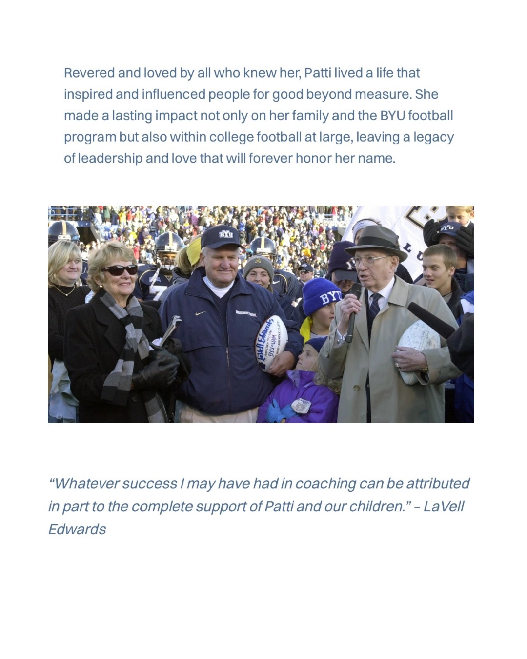 She made a lasting impact not only on her family and the BYU football program but also within college football at large, leaving a legacy of leadership and love that will forever honor her name.