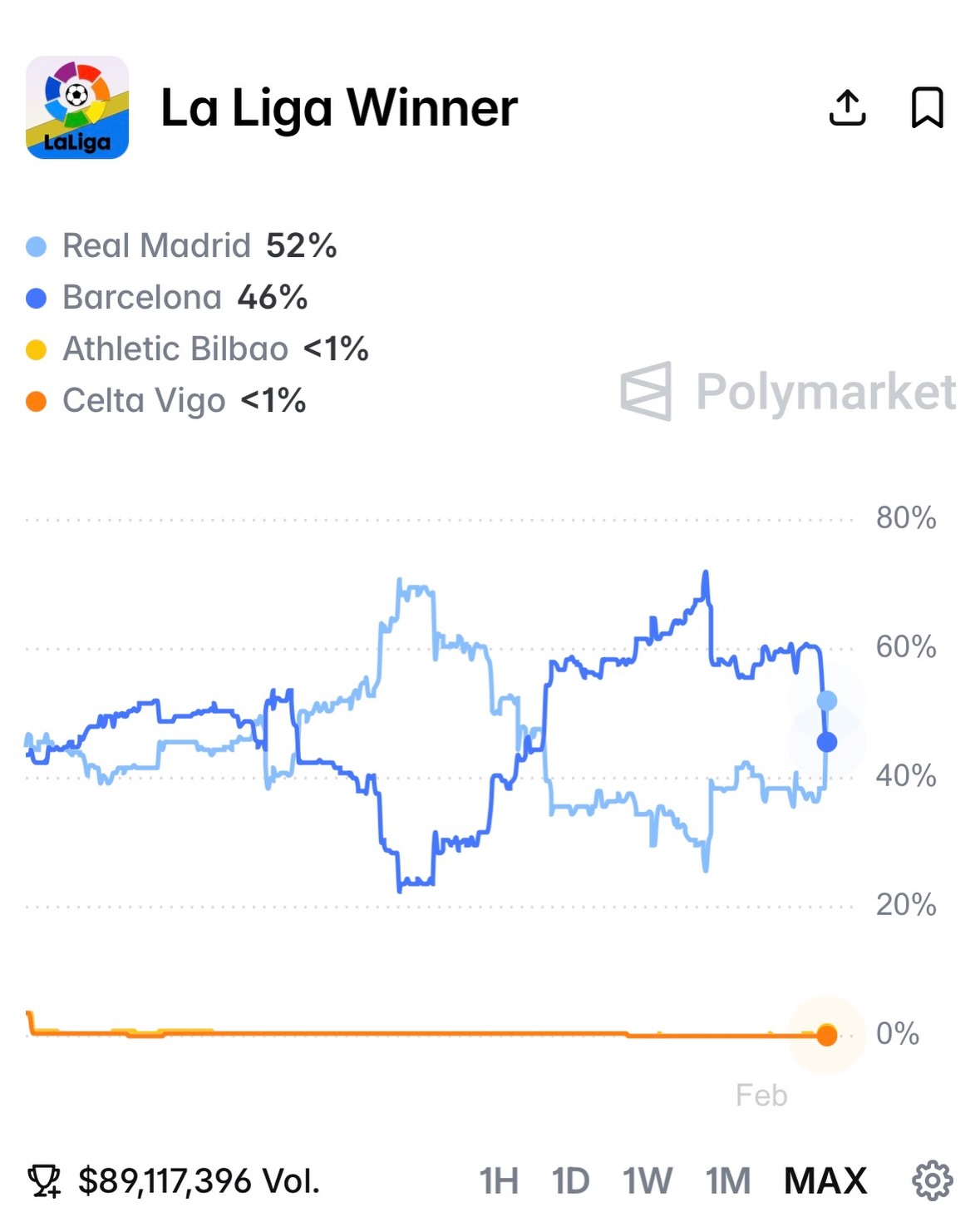 Real Madrid are now the favorites to win it on Polymarkets with a 52%. π