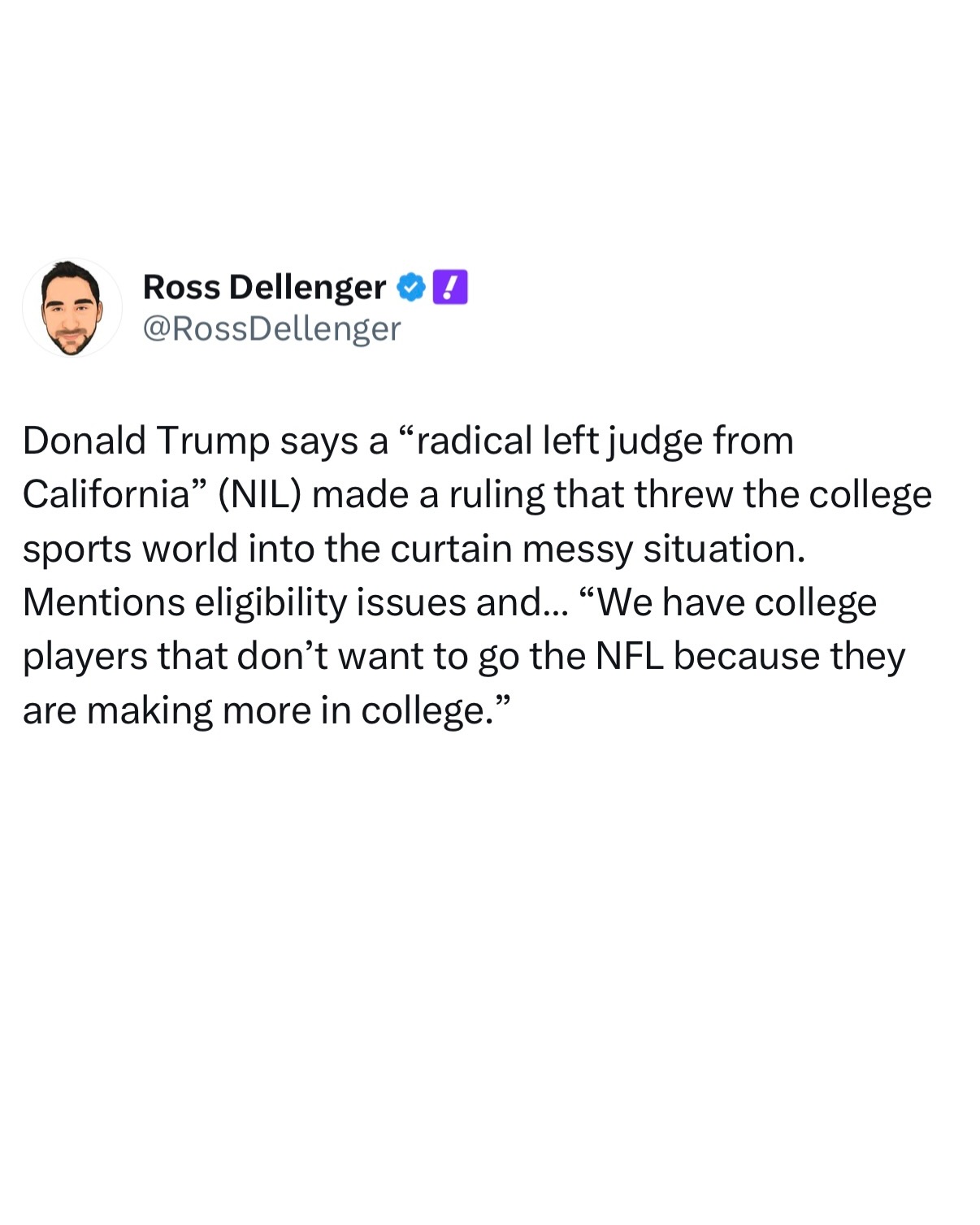 Trump also said a “radical left judge from California” (NIL) made a ruling that threw the college sports world into the curtain messy situation.