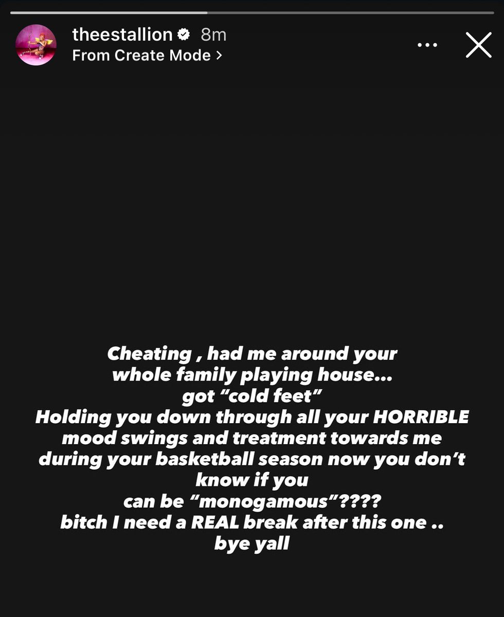 Megan Thee Stallion appears to call out NBA star Klay Thompson in a recent IG Story, accusing him of cheating and referencing issues during their relationship. “Cheating, had me around your whole family playing house… got ‘cold feet’ Holding you down through all your HORRIBLE mood swings and treatment towards me during your basketball season… now you don’t know if you can be ‘monogamous’?”