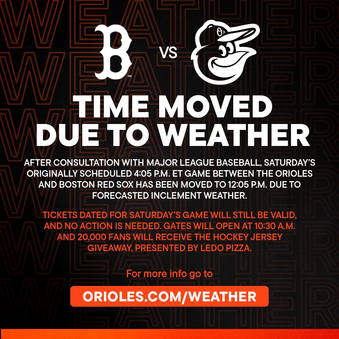 After consultation with Major League Baseball, Saturday’s originally scheduled 4:05 p.m. ET game between the Orioles and Boston Red Sox has been moved to 12:05 p.m. due to forecasted inclement weather.