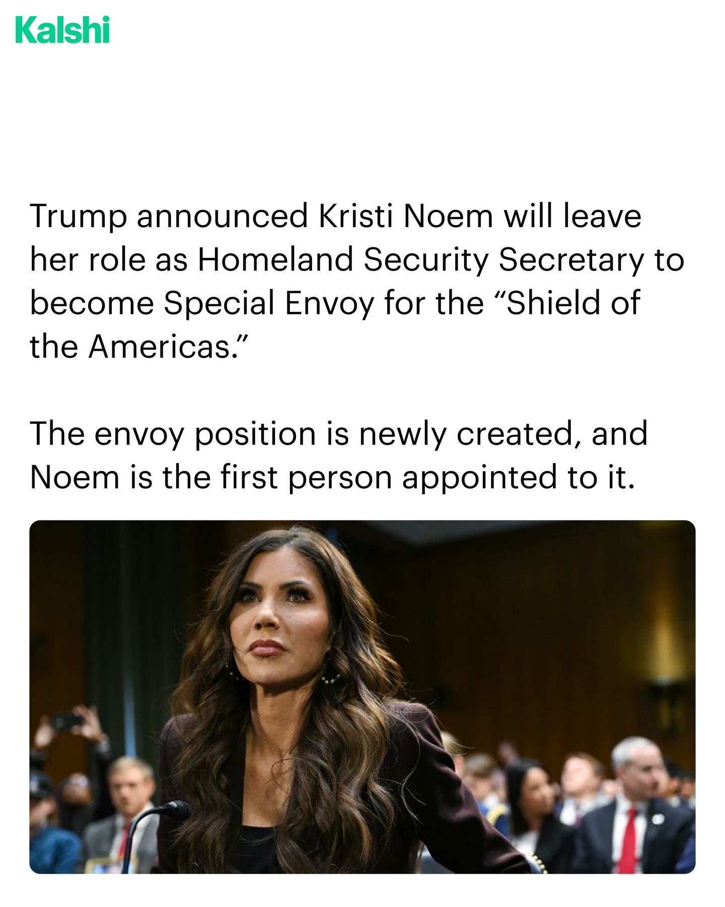 Trump announced Kristi Noem will leave her role as Homeland Security Secretary to become Special Envoy for the “Shield of the Americas.”