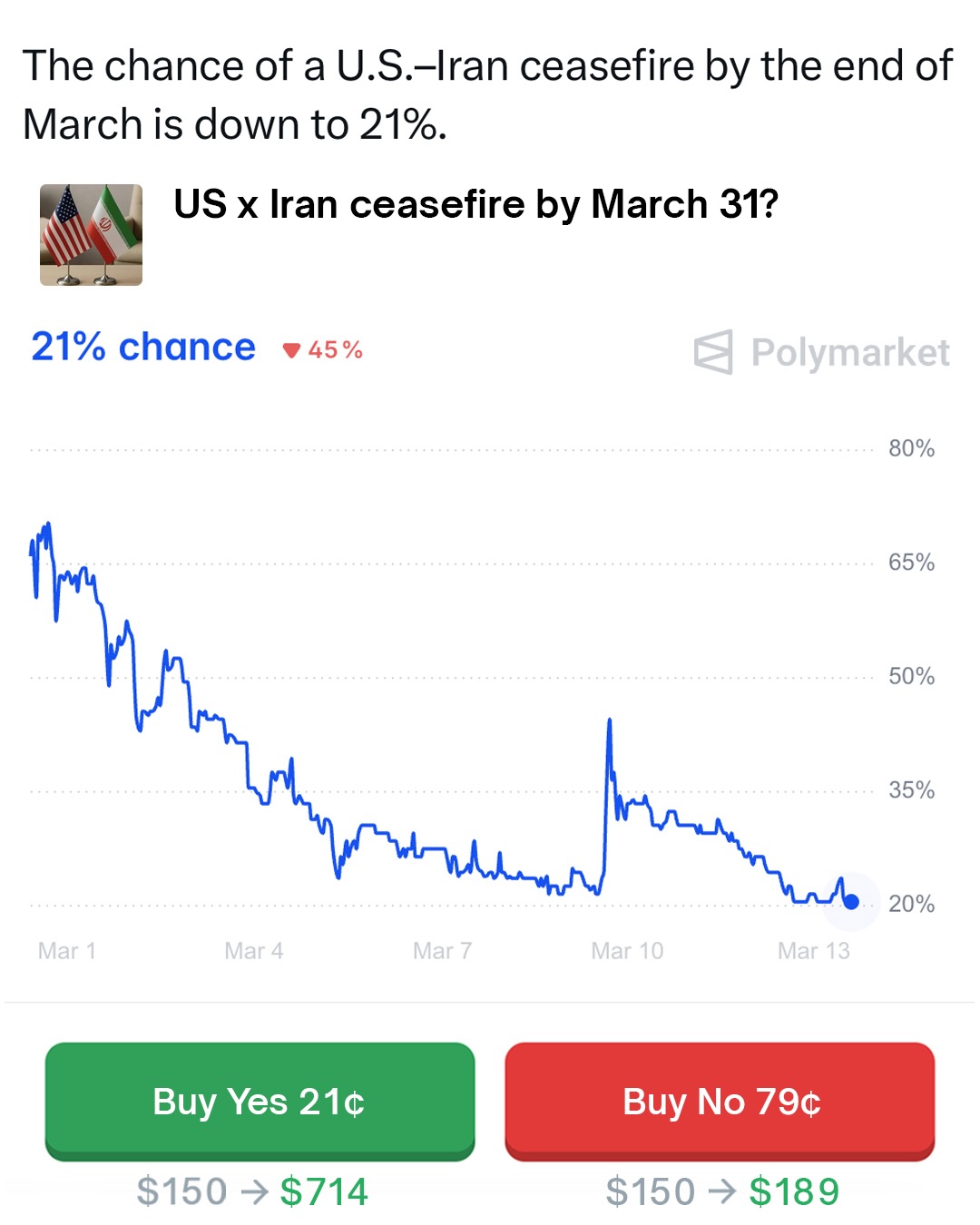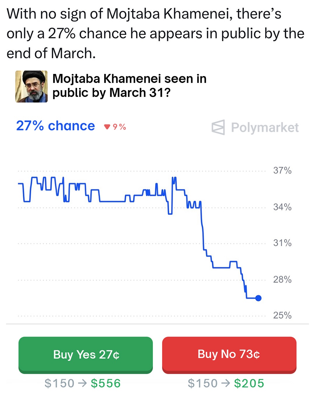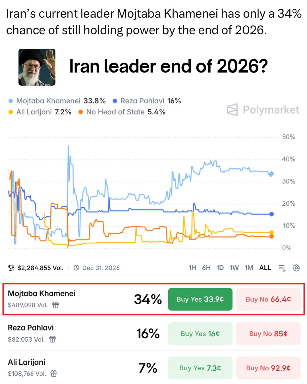 Only a 34% chance Motjaba Khamenei will be Iran’s leader by the end of 2026.