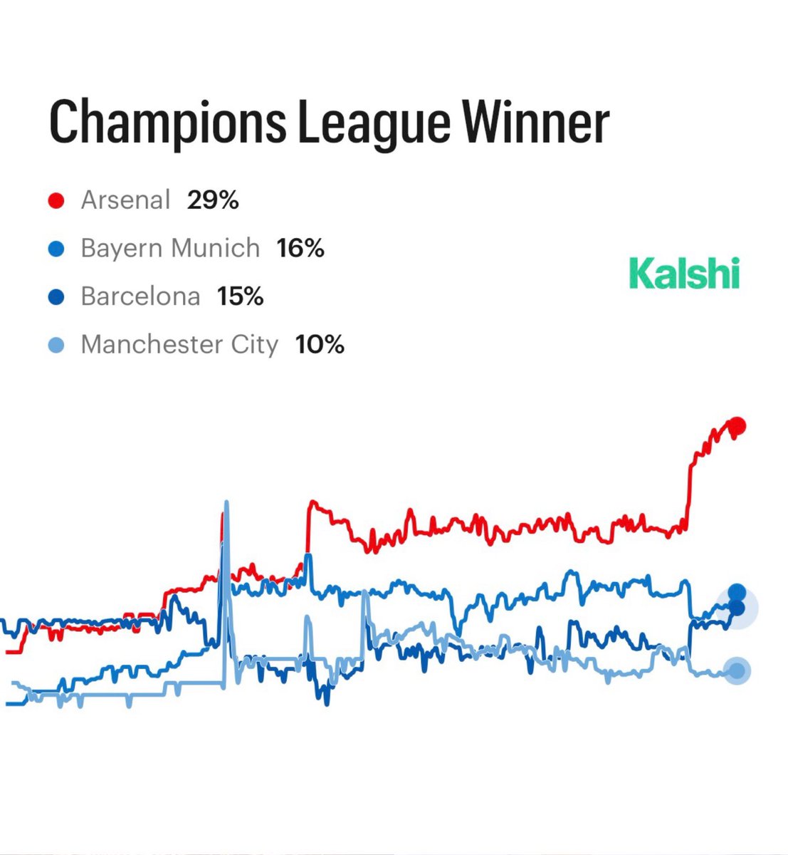 CHAMPIONS LEAGUE TODAY! Odds to win it all, via Kalshi: 29% — Arsenal 16% — Bayern Munich 15% — Barcelona 10% — Man City 9% — Liverpool, PSG 6% — Real Madrid 4% — Atletico, Chelsea 2% — Newcastle, Tottenham, Sporting Lisbon, Bodø/Glimt