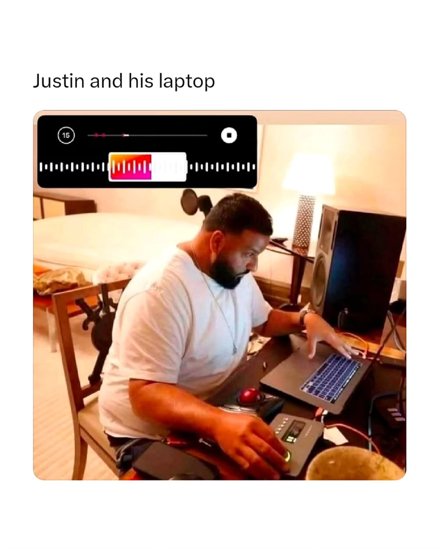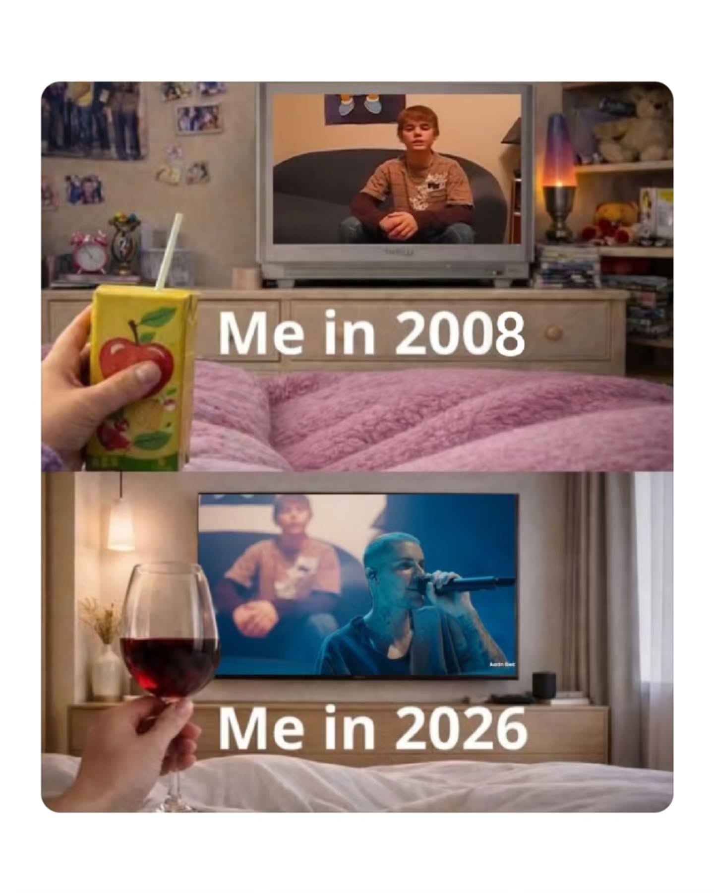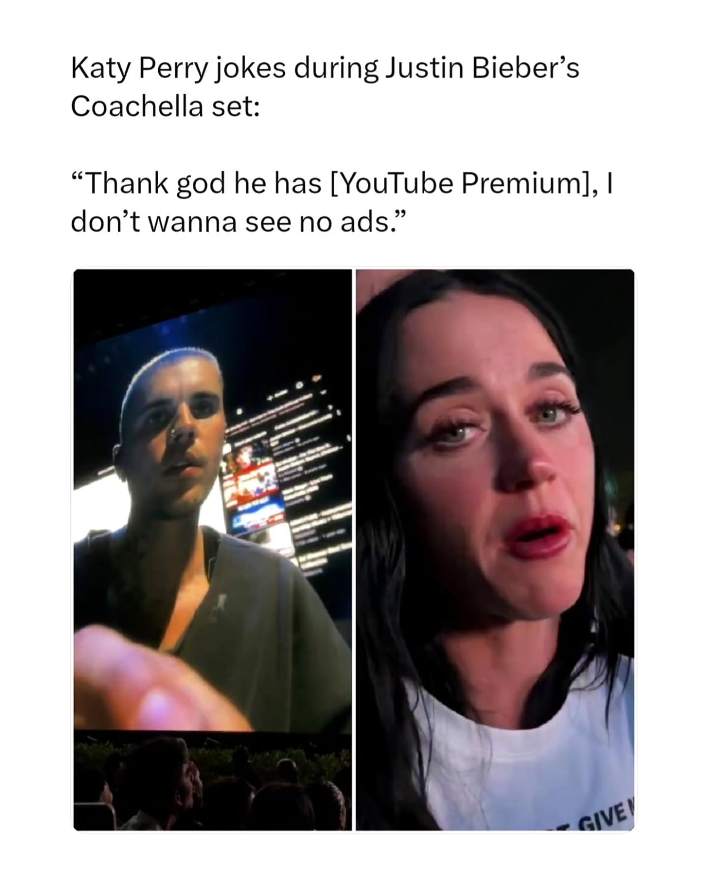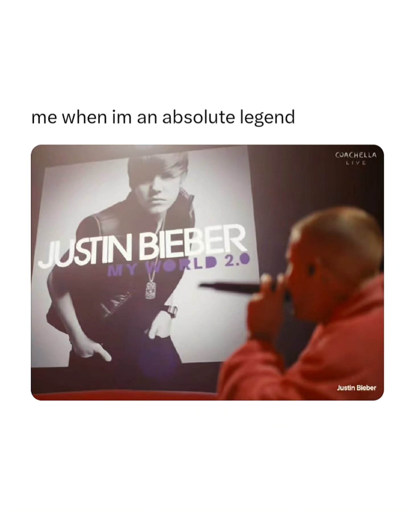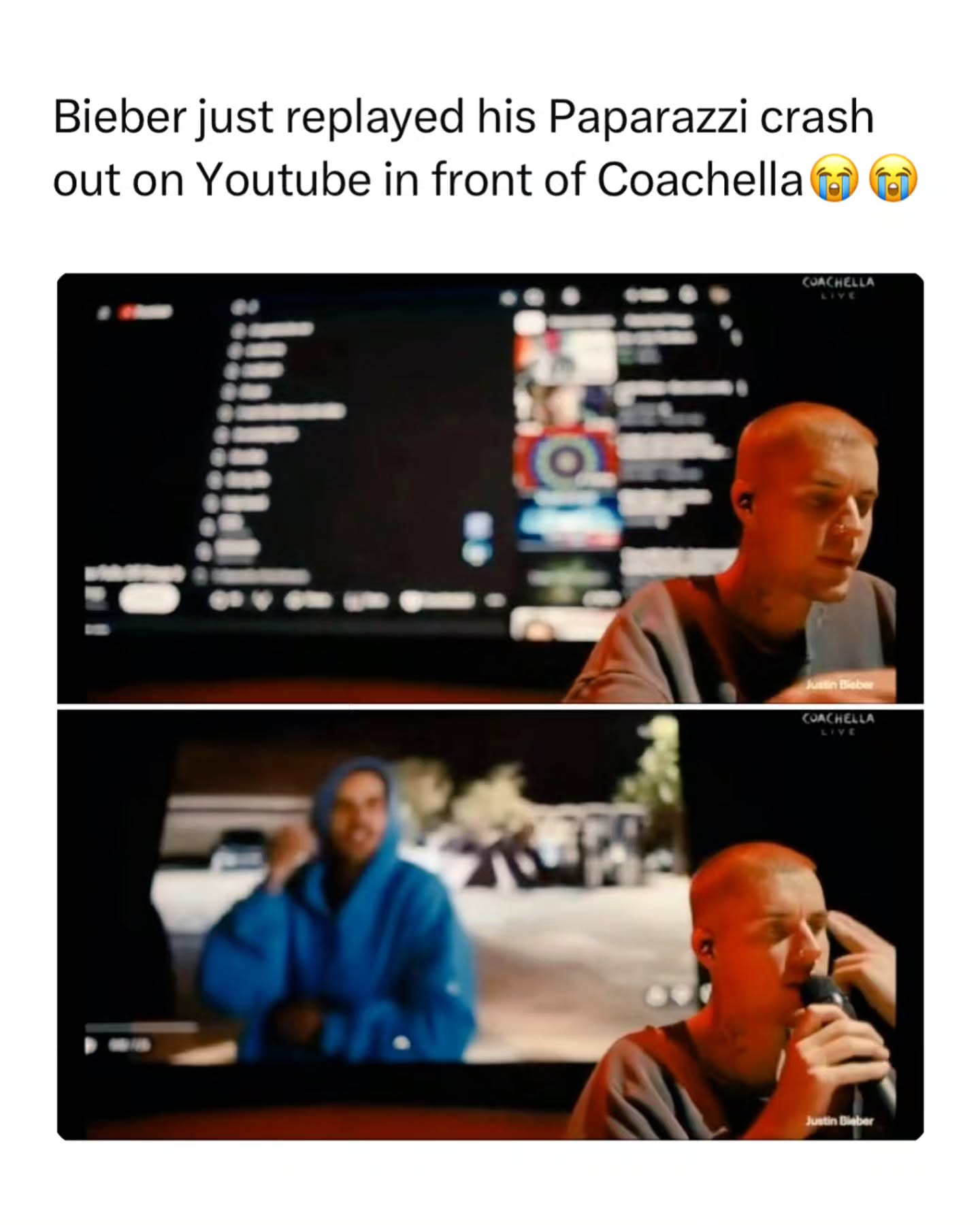 Justin Bieber pulled up with a laptop at Coachella, started searching his own classic music videos and viral memes on YouTube, then turned it into a full karaoke session. Fans were shouting requests, and he was actually taking them.