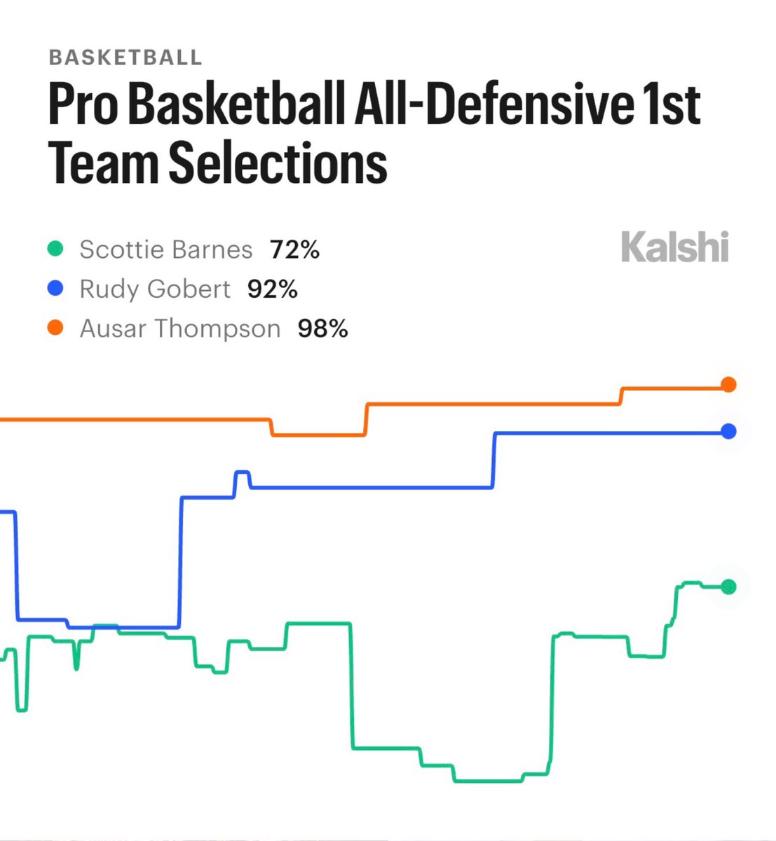 Projected NBA All-Defensive Teams, via Kalshi forecasts: 1st Team: • Victor Wembanyama • Ausar Thompson • Chet Holmgren • Rudy Gobert • Scottie Barnes 2nd Team: • Derrick White • Cason Wallace • Bam Adebayo • OG Anunoby • Amen Thompson