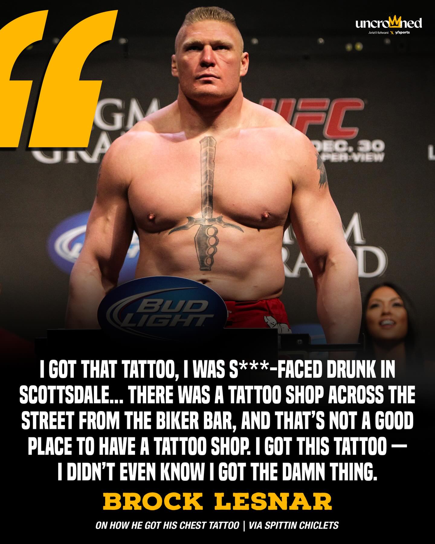 Brock Lesnar finally admitted that the sword tattoo on his chest was a drunken accident ๐ (via @spittinchiclets)