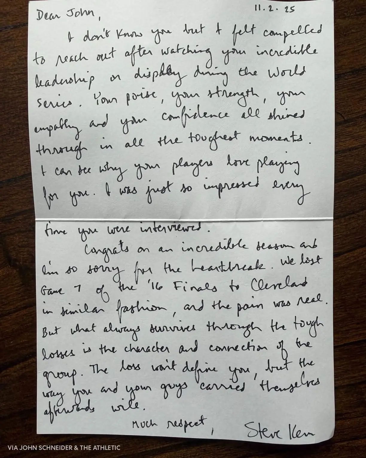 A letter from Steve Kerr praising John Schneider after Toronto's World Series loss sat on the Blue Jays manager's desk all winter until he came back to start the MLB season last week 🤯 (via The Athletic) #bluejays #WorldSeries #stevekerr #stephcurry #MLB