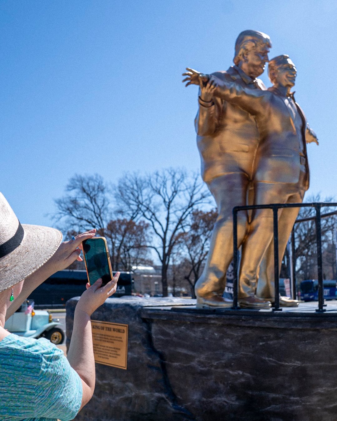 The statue was made by a group known as the Secret Handshake, who previously went viral for their statue of Trump and Epstein holding hands in 2025. The plaque on the statue, titled “The King of the World,” highlights the alleged “bond” between the two men and has received criticism from White House reps.