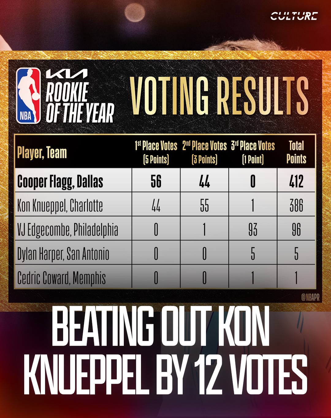 COOPER FLAGG WINS ROTY π₯π Closely beating out Kon Knueppel of the Charlotte Hornets by just 12 votes