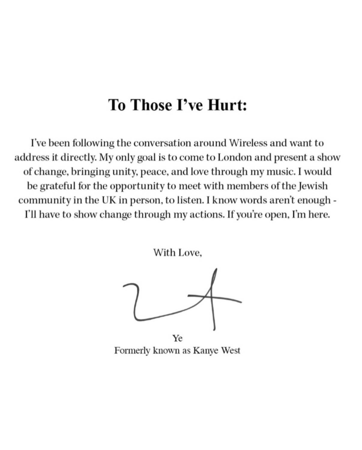 “I know words aren’t enough - I’ll have to show change through my actions. If you’re open, I’m here. With Love, Ye, formerly known as Kanye West.”