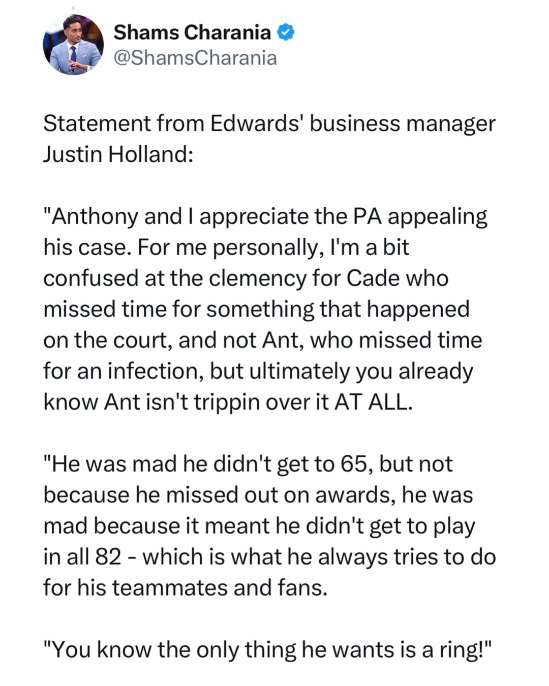 Anthony Edwards filed an Extraordinary Circumstances Challenge for the 65-game award rule, but it was denied per @shams