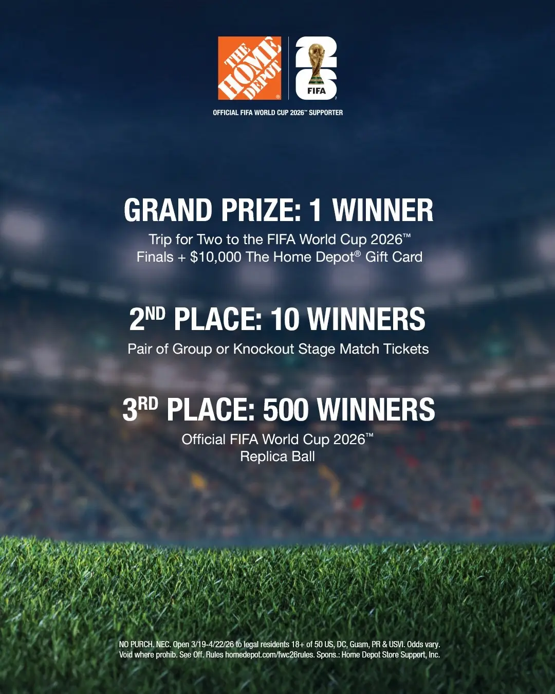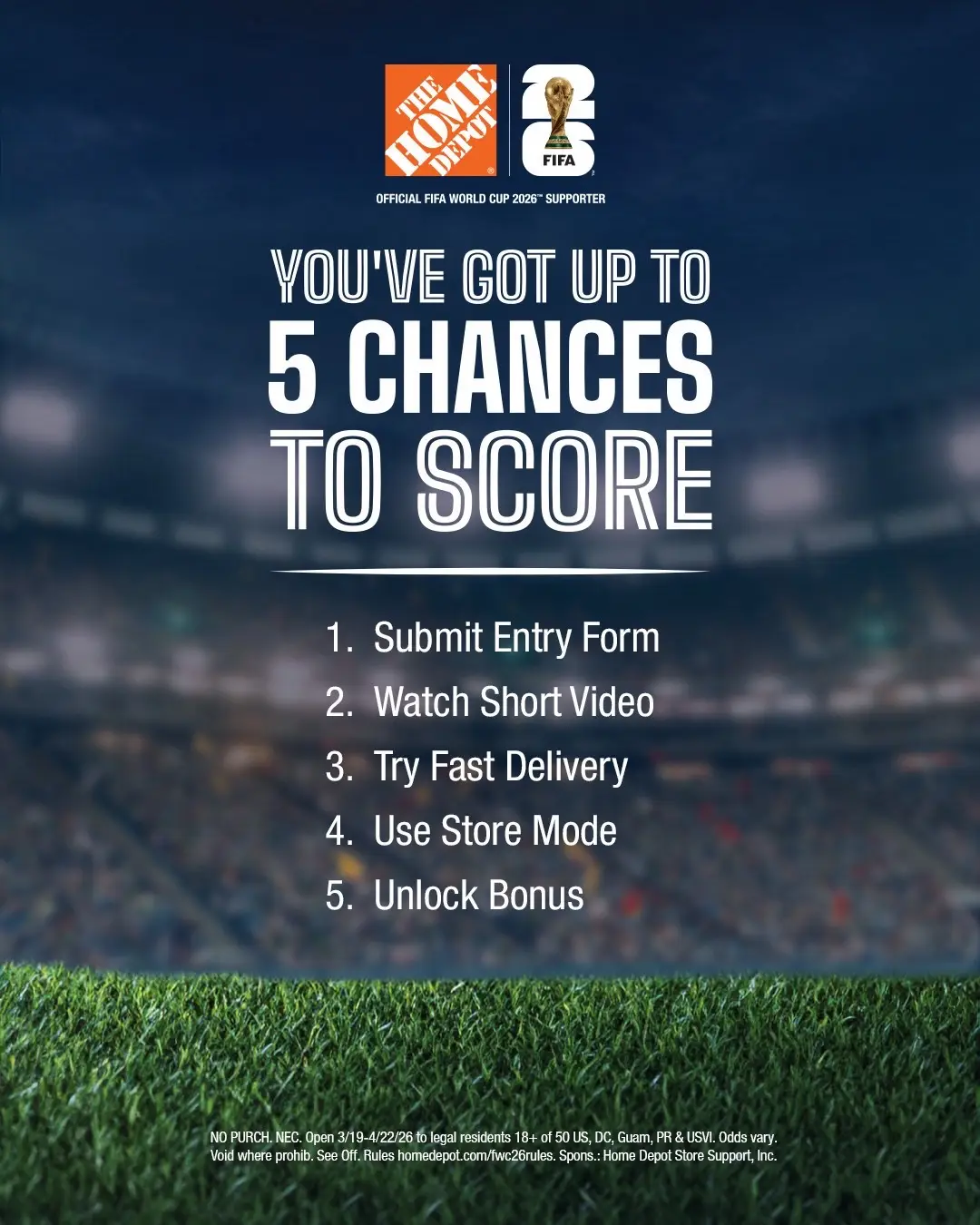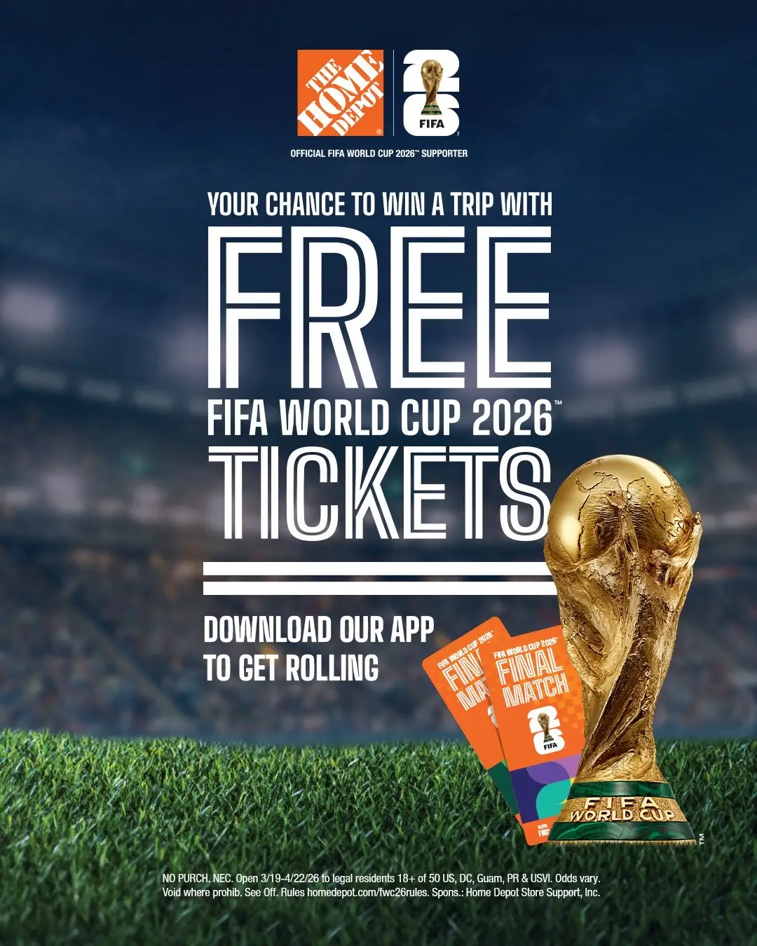 ATTN: Soccer fans 📢 Now’s your chance to win a free trip for two to the FIFA World Cup 2026™ Finals plus a $10,000 The Home Depot gift card! Now through 4/22, earn up to 5 chances to win. All you have to do is download The Home Depot App and complete tasks like: ⚽️ Submit entry form ⚽️ Watch short video ⚽️ Try fast delivery ⚽️ Use store mode ⚽️ Finish all four and get a bonus entry on us! Tap the link in our bio to get started. We’re proud to be an Official FIFA World Cup 2026™ Supporter. #fifaworldcup2026 #sweepstakes #Soccer #homedepot