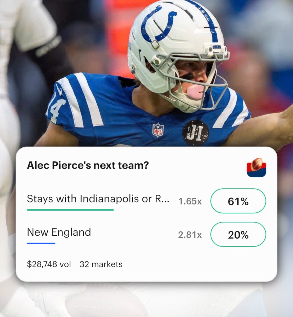 Favorites for Top NFL FA’s, via Kalshi: Alec Pierce: 61% Colts | 20% Patriots Trey Hendrickson: 60% Cowboys | 34% Bucs David Njoku: 30% Eagles | 14% Broncos Will we see any big surprises today?