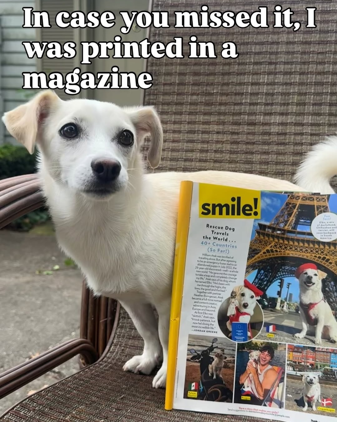 After being adopted by William Atek, his life transformed into one of global adventure. The pair are now attempting to set a world record for the most traveled dog, with Elko visiting over 40 countries.