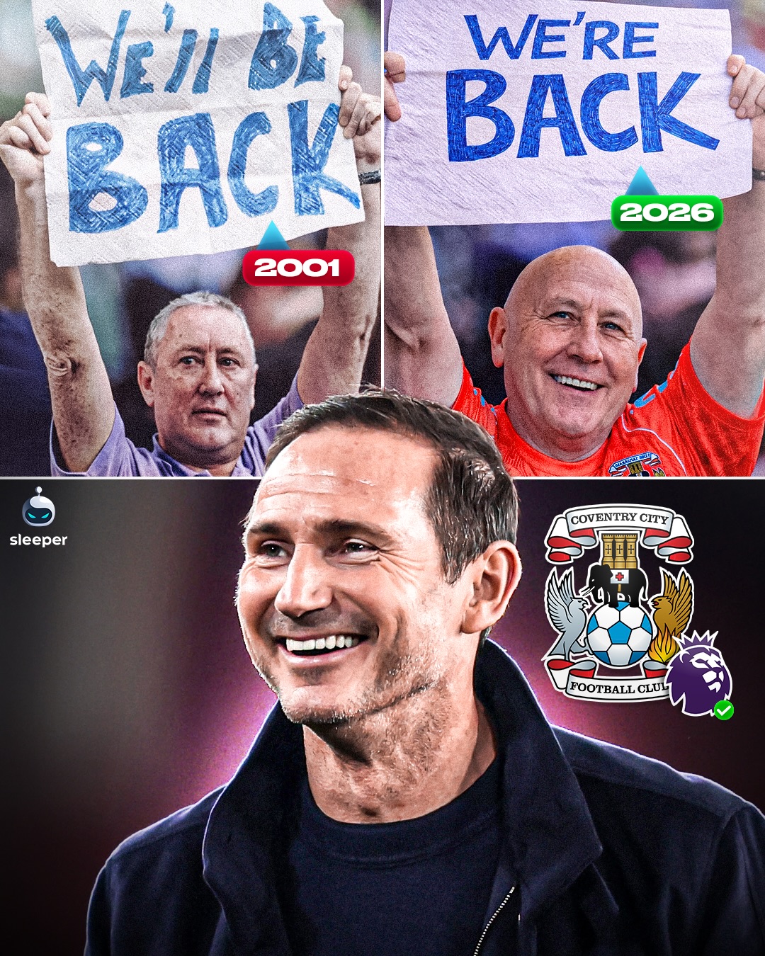 In 2001, this Coventry City fan brought out a banner which read ‘We’ll be back’ after their relegation from the Premier League… it’s been a long journey since, but 25 years later; they’re back and so is he! 🥹❤️