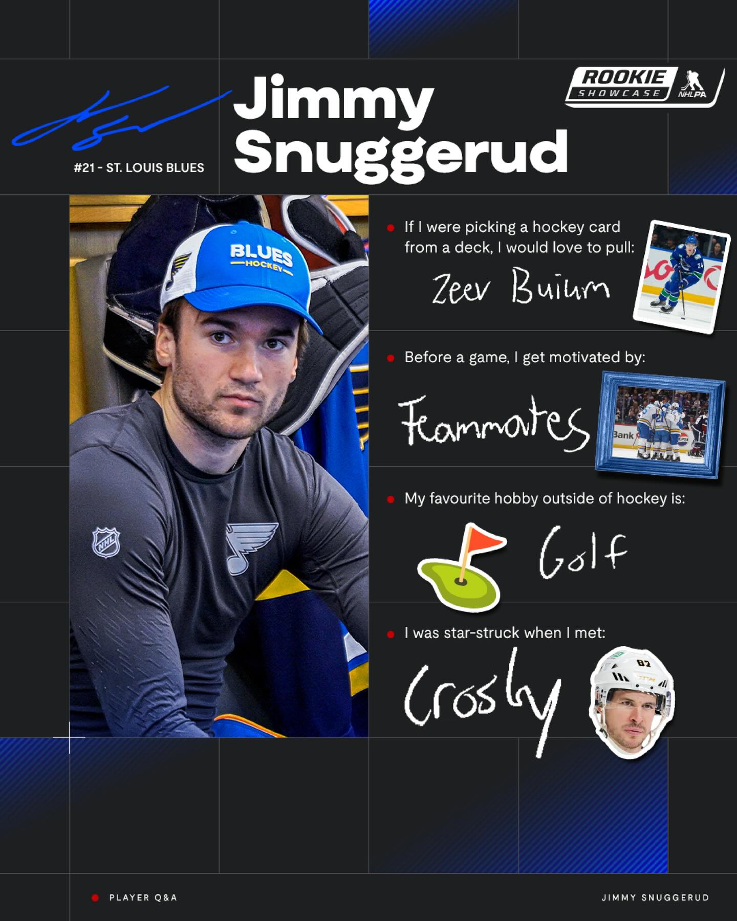 Big Sidney Crosby guy. Big Zeev Buium guy. Jimmy Snuggerud reveals all his favourites in this week’s Player Q&A.