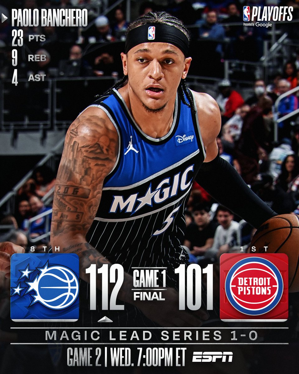 π SUNDAY'S FINAL SCORES π Paolo Banchero powers the @OrlandoMagic to their first road playoff win since 2020, jumping out to a 1-0 lead in Round 1 of the NBA Playoffs presented by @Google! Franz Wagner: 19 PTS, 5 REB, 4 AST, 2 STL Desmond Bane: 17 PTS, 6 REB, 5 AST, 2 STL Wendell Carter Jr.: 17 PTS, 7 REB, 5 AST, 2 STL Jalen Suggs: 16 PTS, 4 REB, 3 STL Game 2: Wednesday, 7pm/et on ESPN