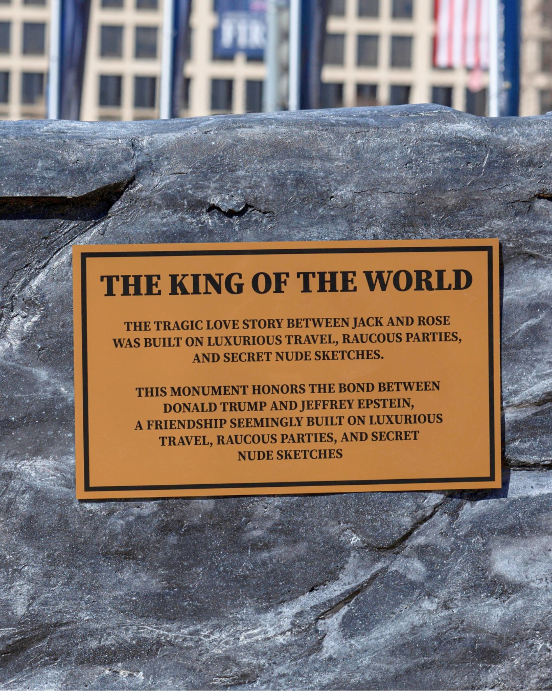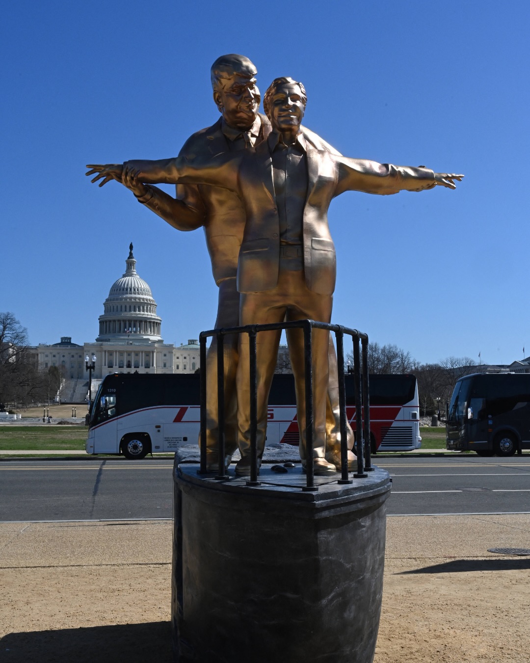 A gold statue depicting Donald Trump and Jeffrey Epstein in the iconic “Titanic” pose has appeared on the National Mall in Washington, D.C. The nearly 12 foot tall sculpture, titled “King of the World,” shows Trump standing behind Epstein with arms outstretched, recreating the famous bow scene from the 1997 film.