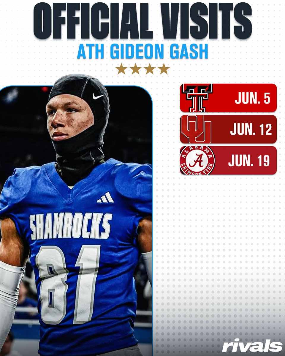 🚨NEWS🚨 4-star ATH Gideon Gash has locked in official visits to Texas Tech, Oklahoma, and Alabama, @AllenTrieu reports✈️ Read: t.co/jYOKJ6V4aQ