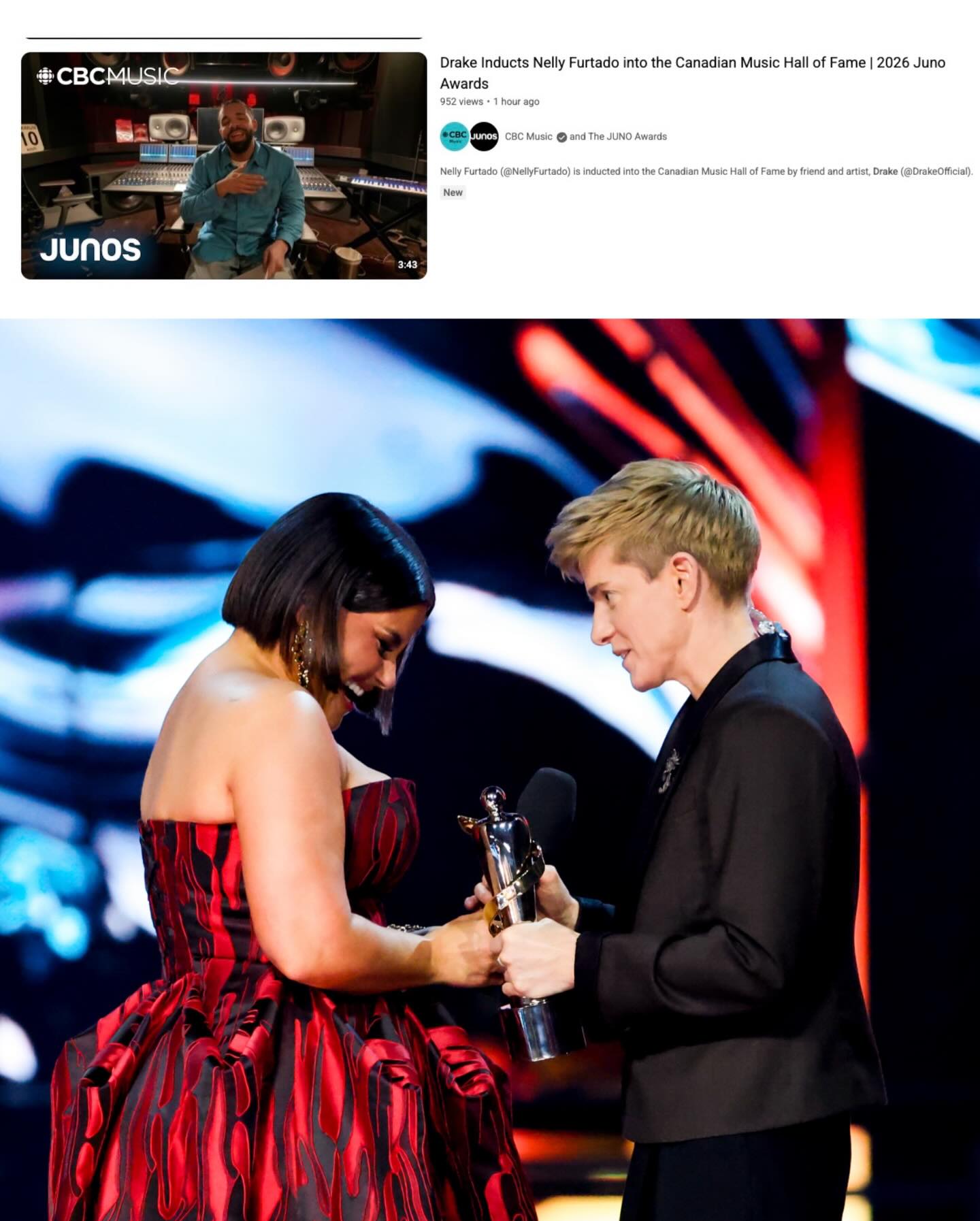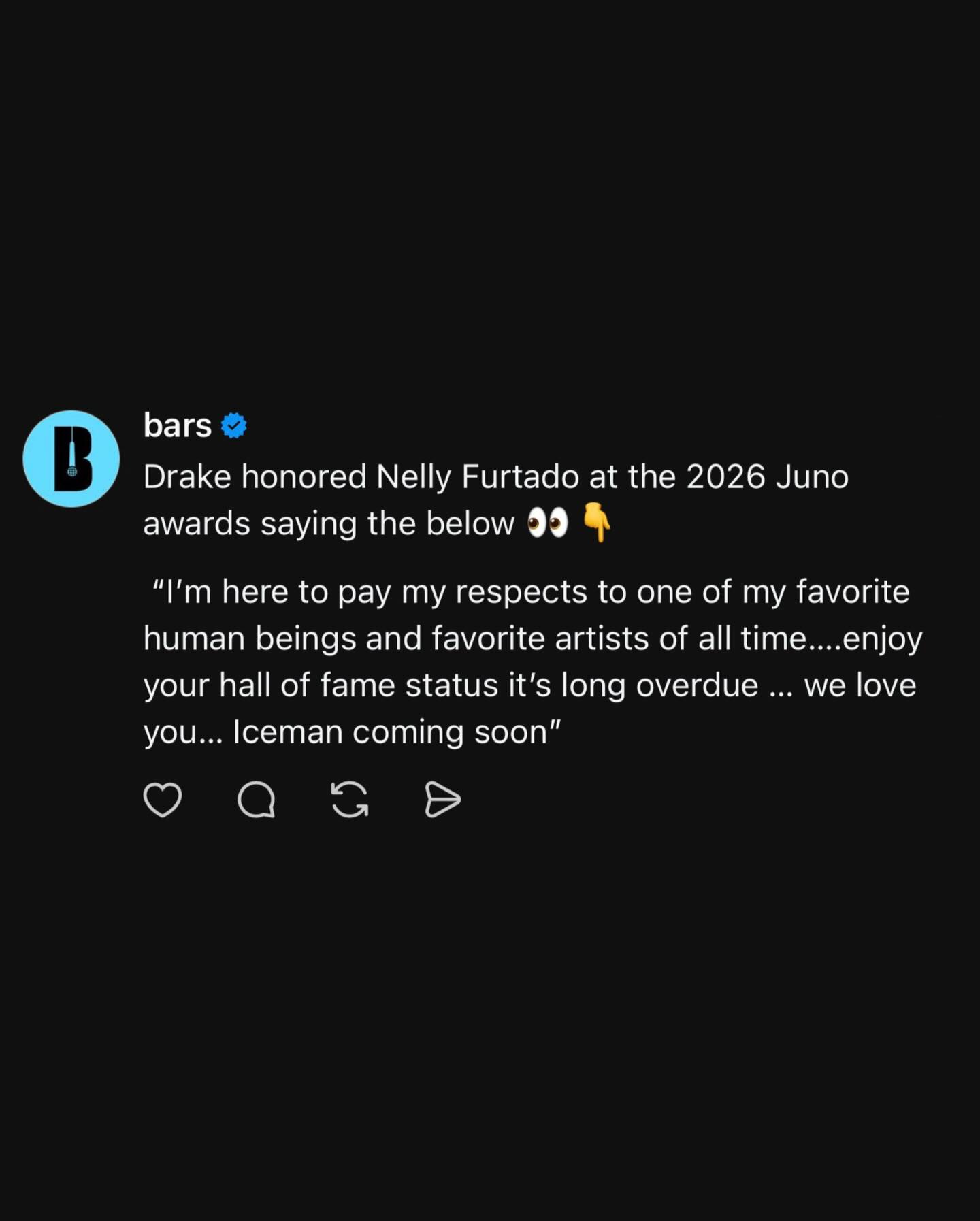 Drake shared a message honoring Nelly Furtado at the 2026 JUNO awards saying 👀👇