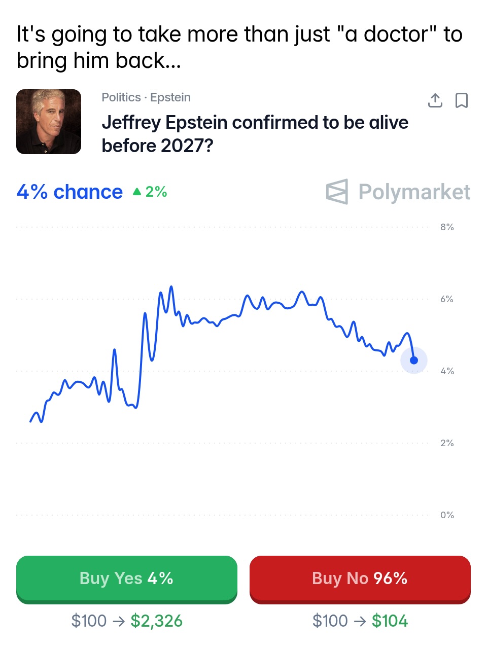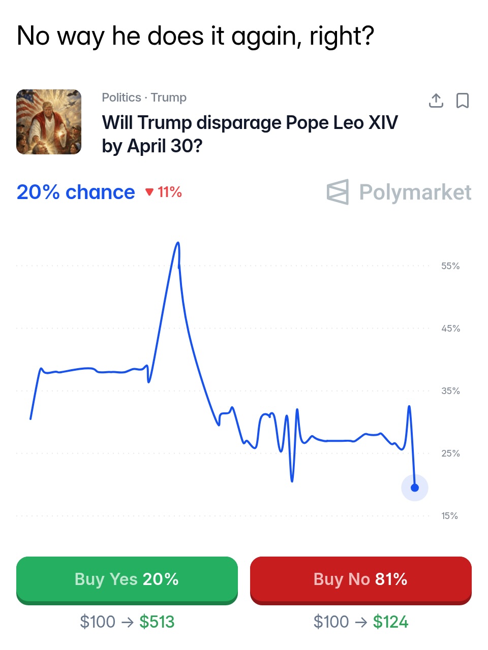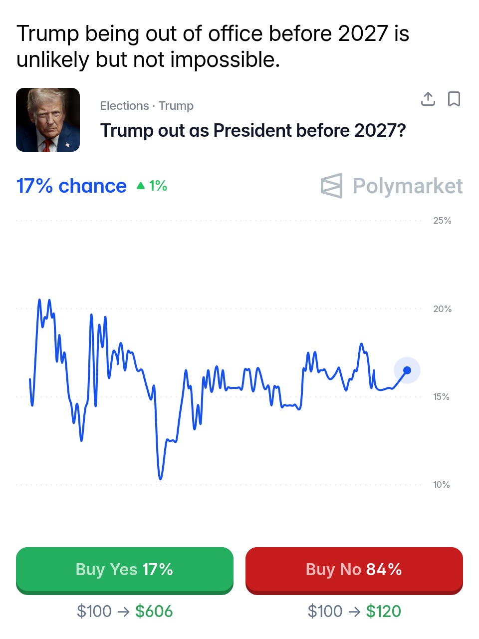 Traders predict a 17% chance Trump will be out as President before 2027.