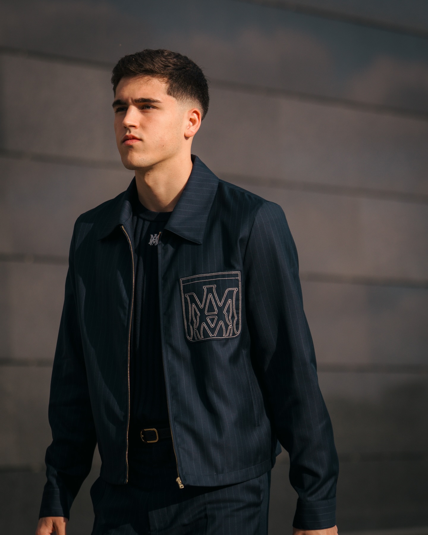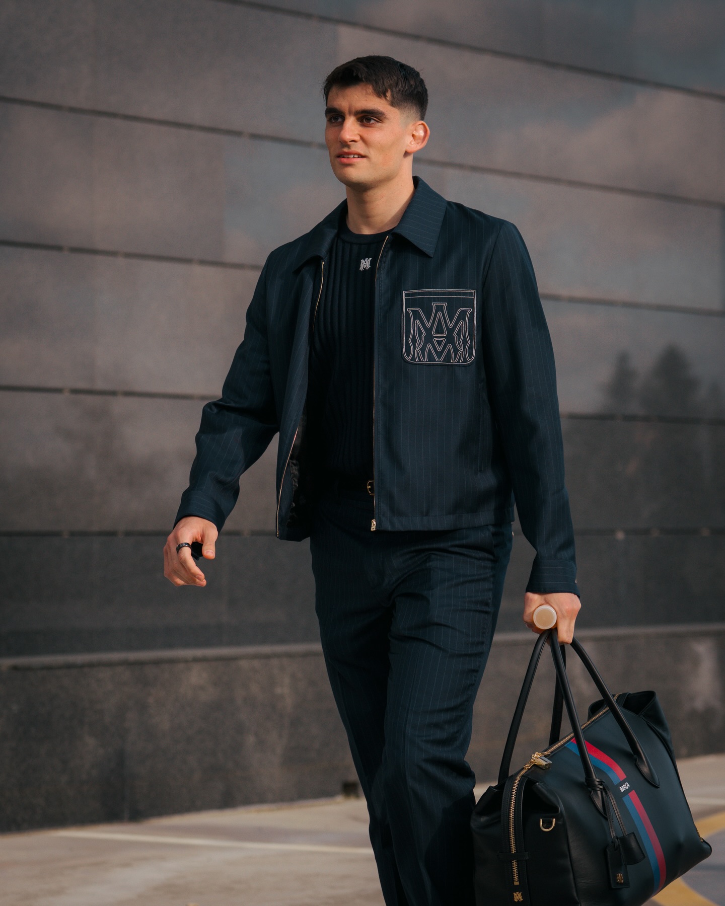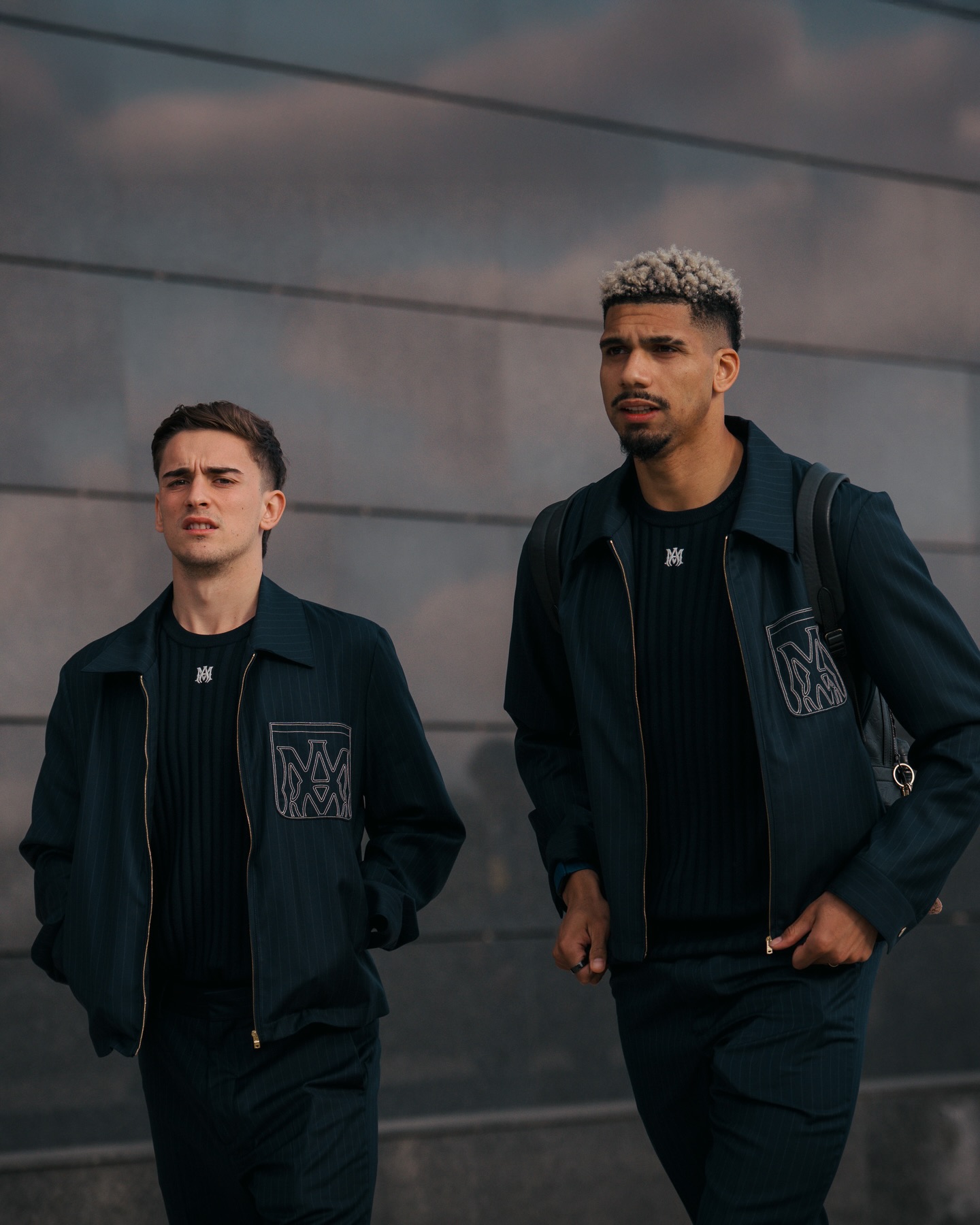 Summer tailoring debuts for the UEFA Champions League Round of 16 – pinstripe shirt-collar blousons with MA Monogram embroidery and lightweight sport-silhouette knits with contrast MA monogram and tonal FC Barcelona detailing merge classic formality with Barça’s heritage and AMIRI’s modern innovation. @amiri @fcbarcelona @mikeamiri