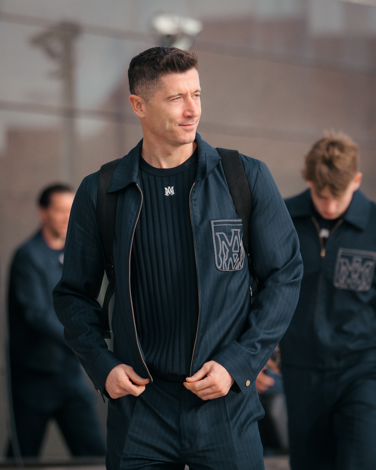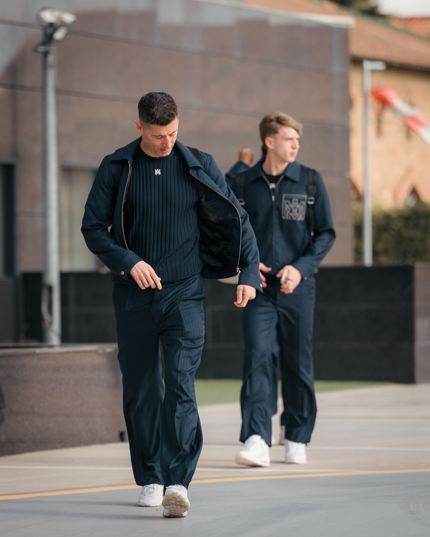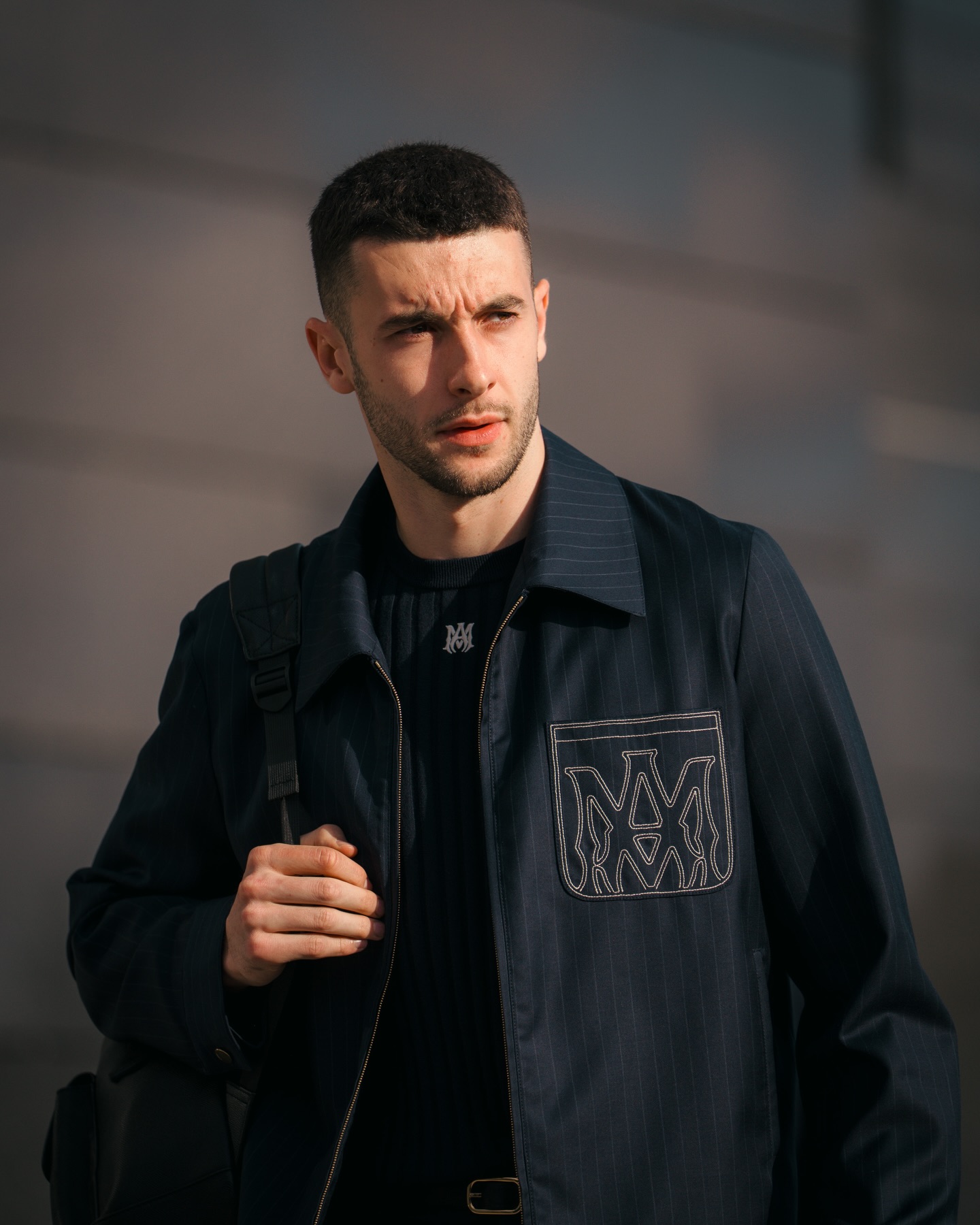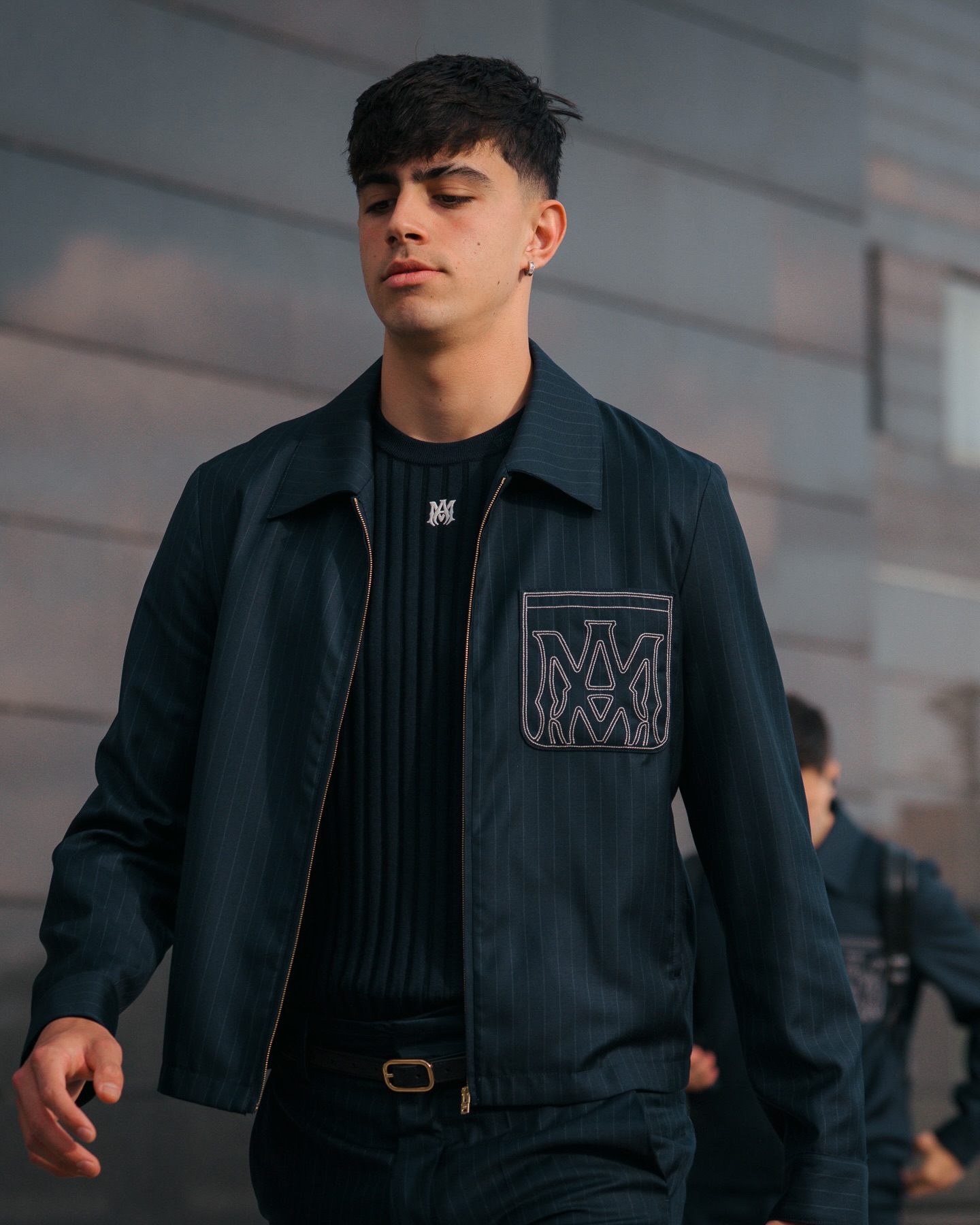 Summer tailoring debuts for the UEFA Champions League Round of 16 – pinstripe shirt-collar blousons with MA Monogram embroidery and lightweight sport-silhouette knits with contrast MA monogram and tonal FC Barcelona detailing merge classic formality with Barça’s heritage and AMIRI’s modern innovation. @amiri @fcbarcelona @mikeamiri