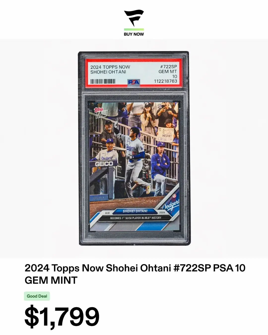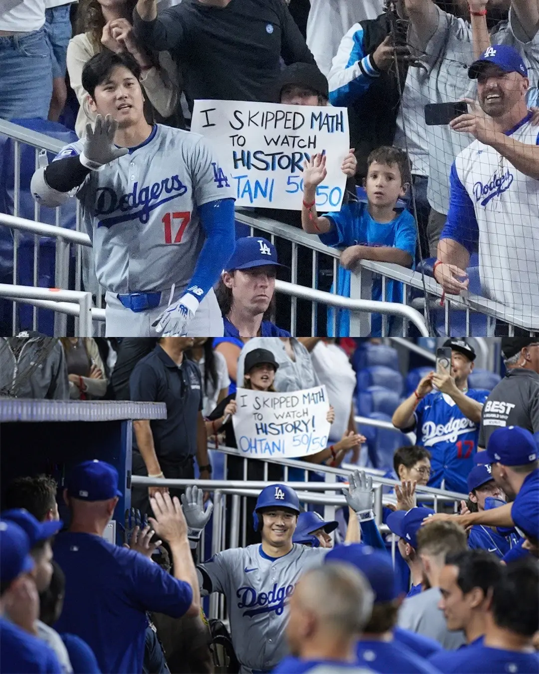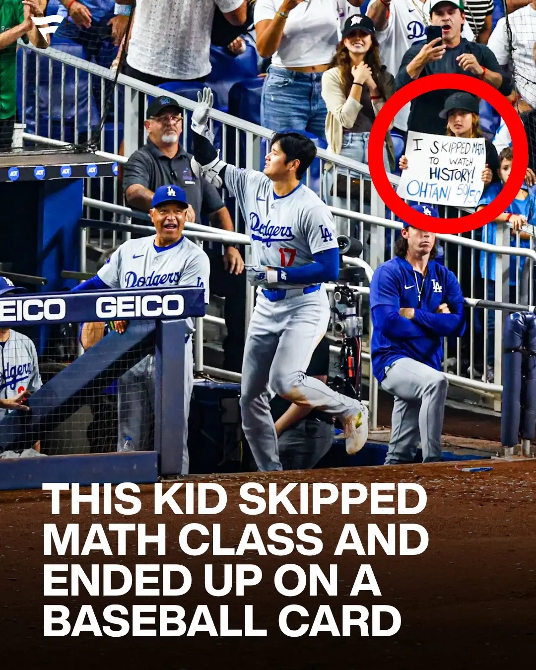 During Shohei Ohtani’s 50/50 game in September 2024, a kid showed up with a sign that read: “I skipped math to watch history!” Then Ohtani delivered one of the most iconic performances the game has ever seen, and during the game, cameras caught the kid and the sign in the background of the moment. The image was later turned into an official baseball card, permanently tying that kid to one of the most historic nights in MLB history.
