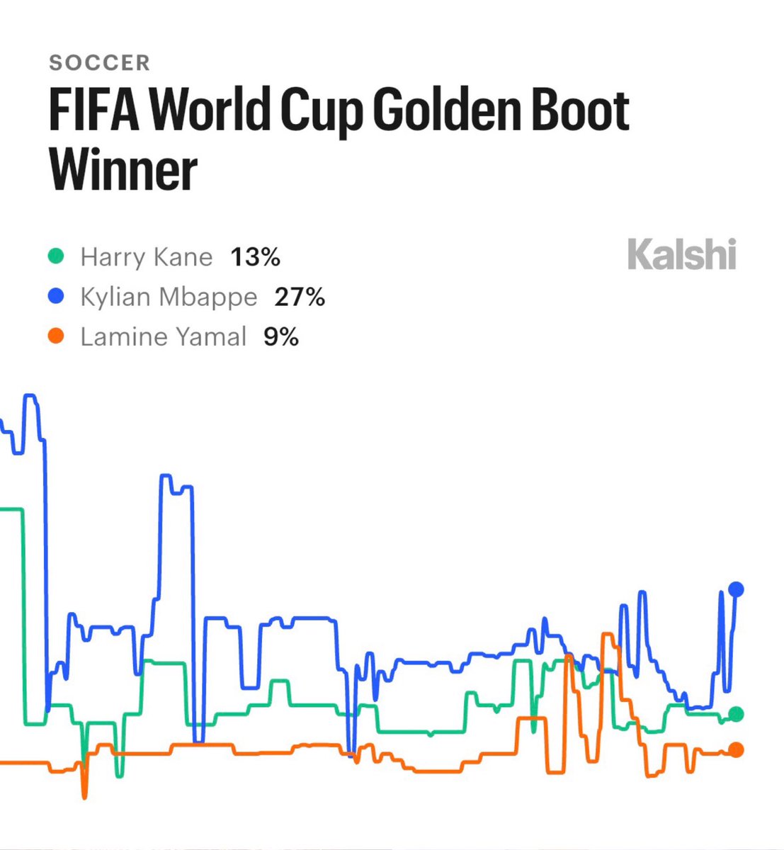Favorites to win Golden Boot at World Cup 2026, via Kalshi: 27% — Kylian Mbappe 13% — Harry Kane 9% — Lamine Yamal 8% — Erling Haaland 8% — Mikel Oyarzabal 6% — Julian Alvarez 6% — Vinicius Jr. 4% — Cristiano Ronaldo 4% — Leo Messi 3% — Luis Diaz 3% — Nick Woltemade