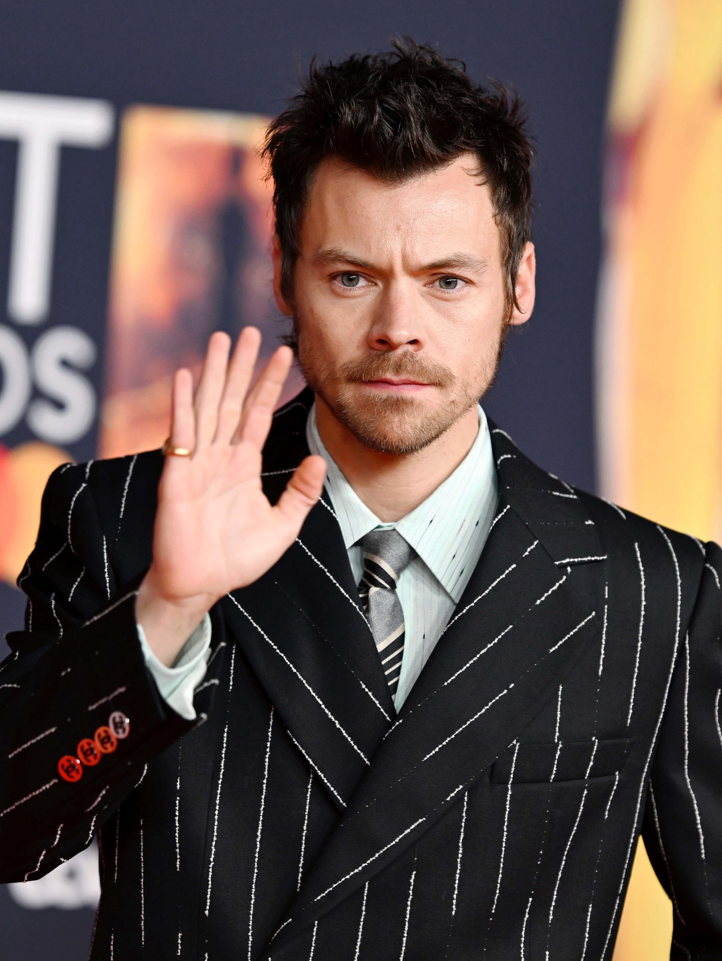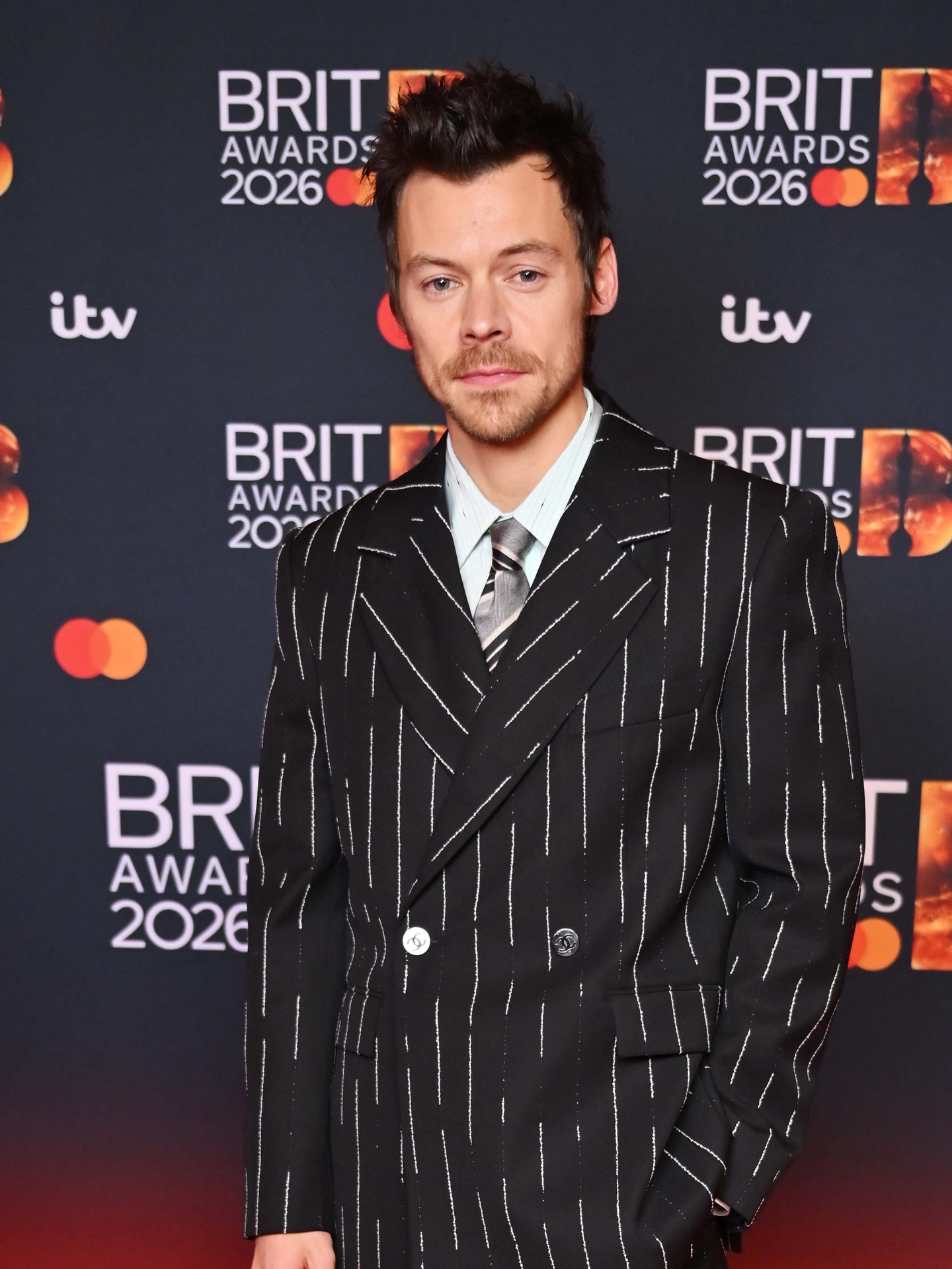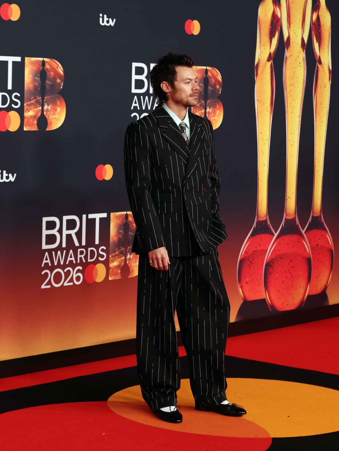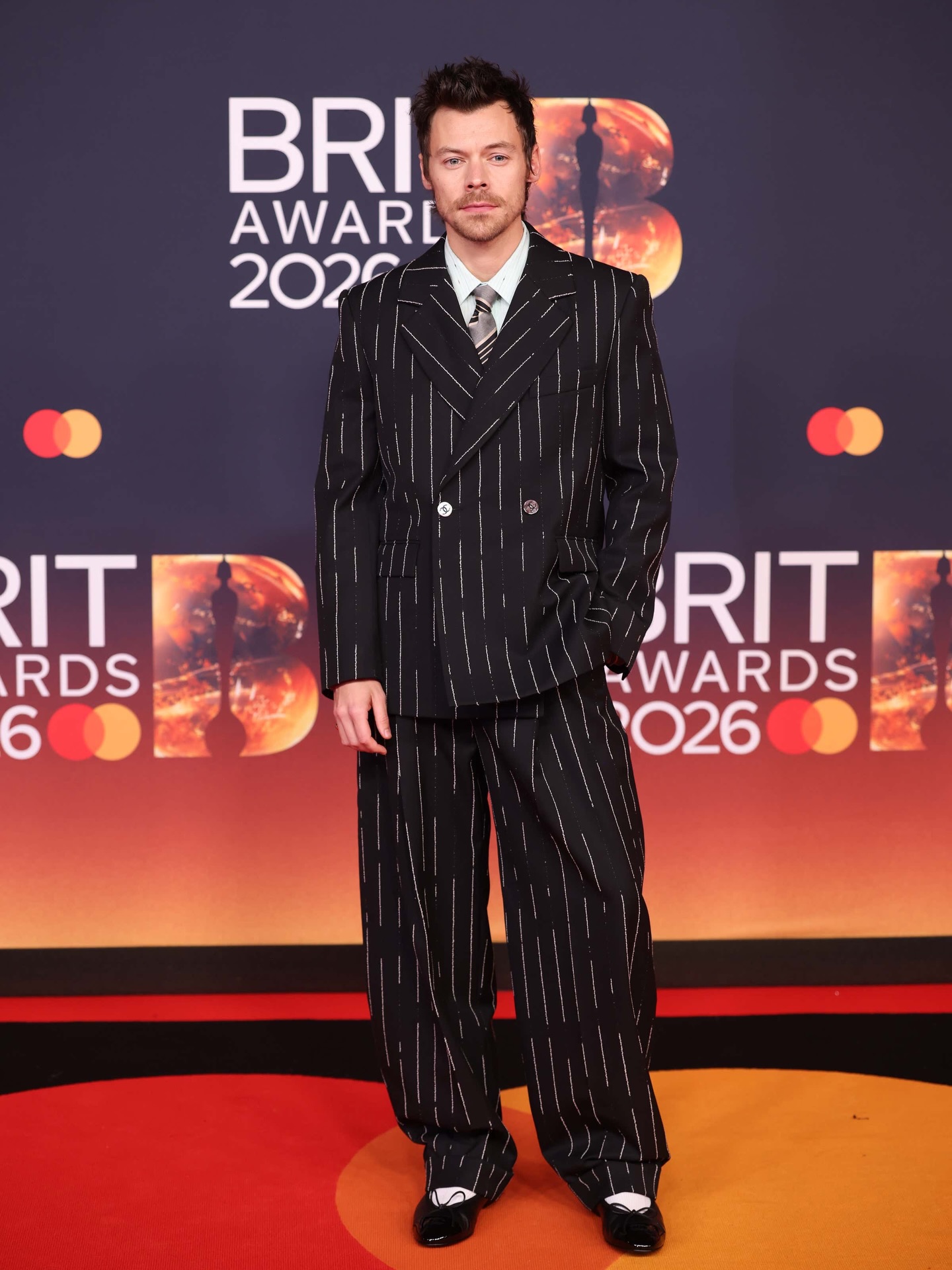 Harry Styles looking sharp in pinstripes at the Brit Awards today ๐ฅ