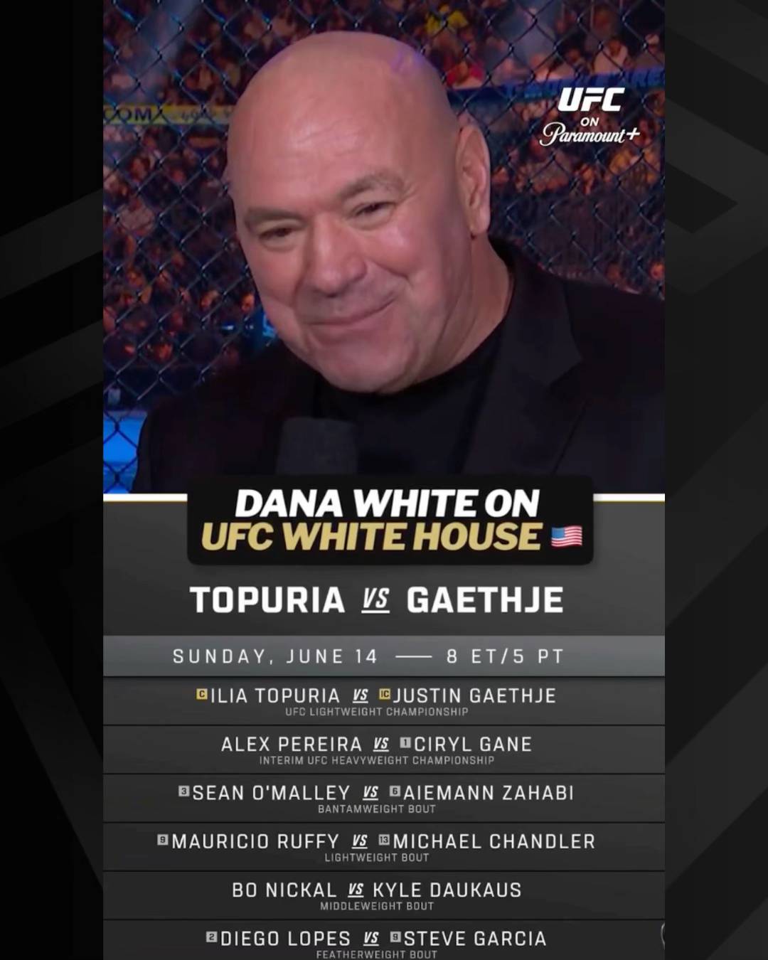 The UFC says it will hold a fight card at the White House on June 14, 2026. According to the announced lineup, the main event is Ilia Topuria vs Justin Gaethje for the UFC lightweight championship. The co main is Alex Pereira vs Ciryl Gane for an interim UFC heavyweight championship. The rest of the announced main card includes Sean O’Malley vs Aiemann Zahabi, Mauricio Ruffy vs Michael Chandler, Bo Nickal vs Kyle Daukaus, and Diego Lopes vs Steve Garcia. #Pubity #Viral #Sports