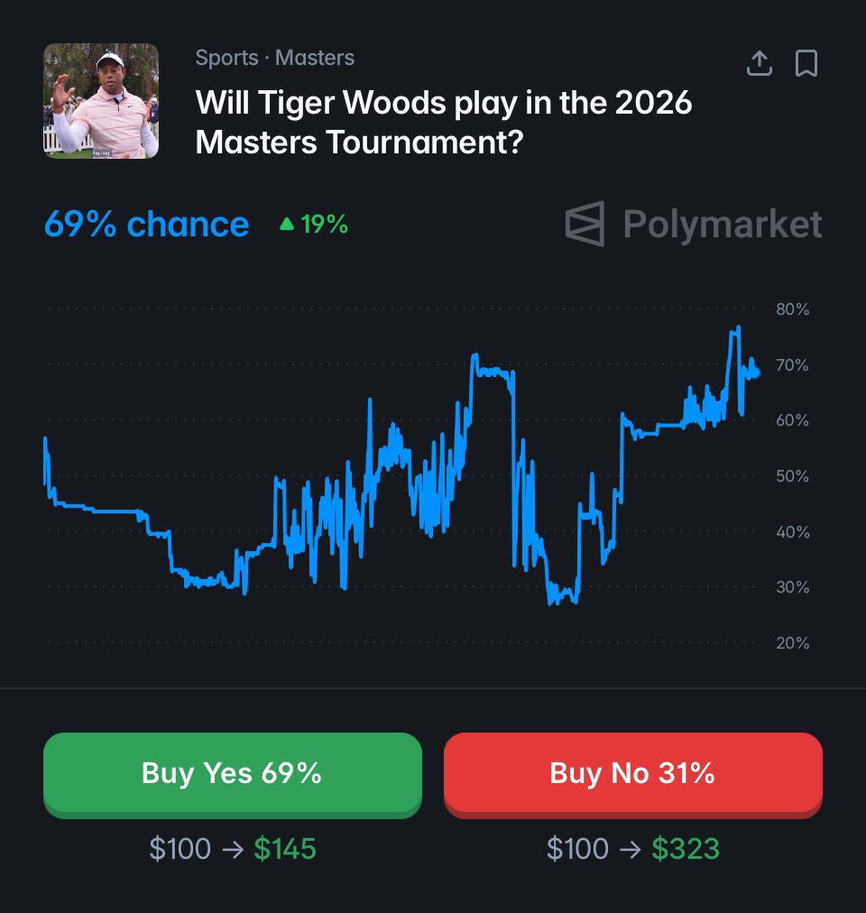 BREAKING: Tiger Woods’ odds to play the Masters this year have shot up to 69% He won in 2019, then missed 2025 due to surgery.