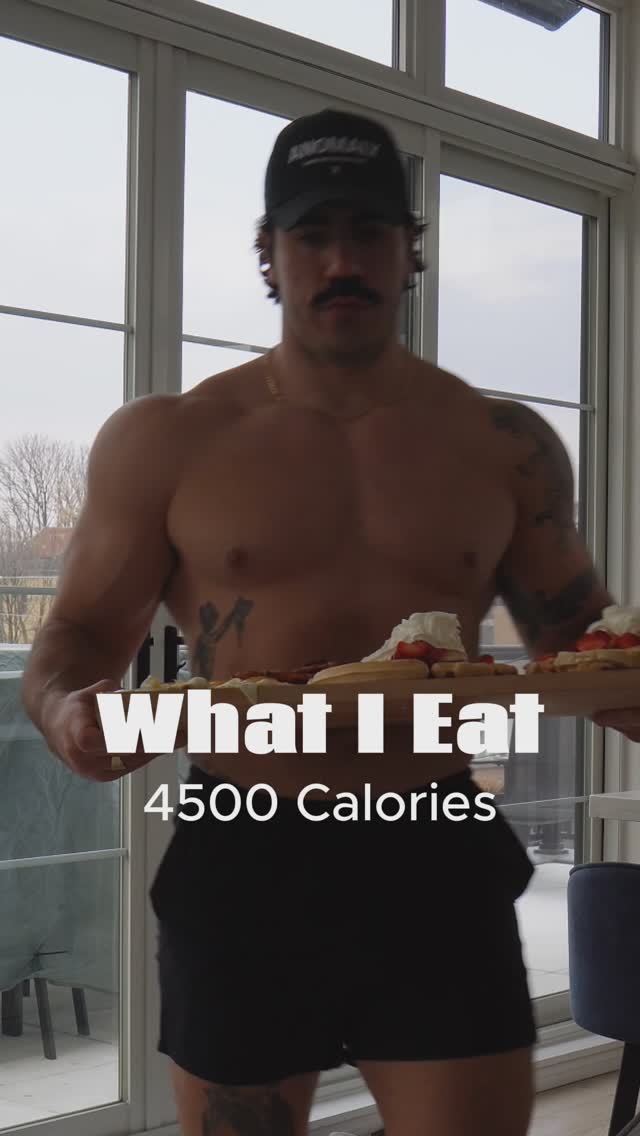 This is everything I eat in a day as a 6’2 270lbs meat muffin with @bastardburrito . We started the day off with a colossal breakfast: 2 protein Belgian waffles topped with bananas, strawberries, whipped cream and natural maple syrup.