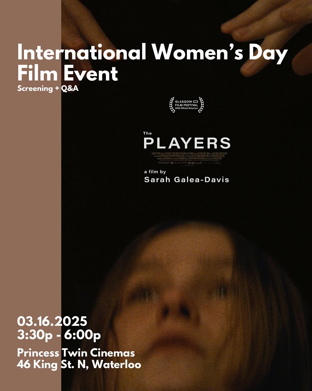 It’s our 3rd annual IWD film screening celebrating Canadian women filmmakers. This year we have a special preview screening of THE PLAYERS, a feature drama written and directed by Sarah Galea-Davis about a 15 year old aspiring actor whose acceptance into an avant garde theatre company in 1994 Toronto thrusts her into a world of unwritten rules, blurred lines, and complex power dynamics. THE PLAYERS is currently in its festival run, premiering internationally at Glasgow Film Festival on March 6.