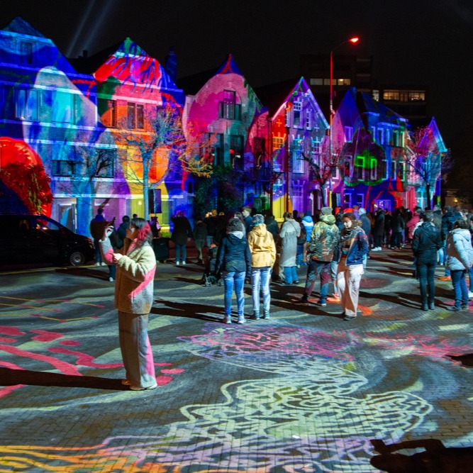 Eighty years ago, Eindhoven was liberated, and its citizens celebrated by placing small lights in their windows, an act now immortalized as the “Lichtjesroute” (Route of Lights). Syntropia by Cindy Lo retraces this path, revisiting the homes that once glowed in gratitude, welcoming the soldiers with light. The videomapping at Wilhelminaplein offers a dreamlike journey through lines, shapes, and patterns. Inspired by the poem Handpalm Papier by Michel K., Cindy Lo reflects: