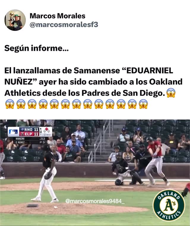 Hoy los Athletics Oakland llaman al lanzallamas de Samanense a “EDUARNIEL NUÑEZ” desde de Las Vegas Aviators en la Sucursal de Triple AAA. ¡OÍTE!🙌🏾🙌🏾🙌🏾🙌🏾🙌🏾🙌🏾🙌🏾🙌🏾🙌🏾🙌🏾🙌🏾🙌🏾🙌🏾