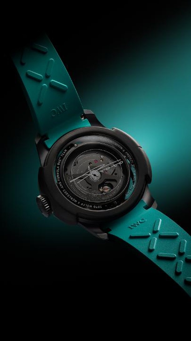 Visible through a sapphire glass case back printed with Toto Wolff’s signature, the plates, bridges and oscillating mass are blackened to match the all-black design.
