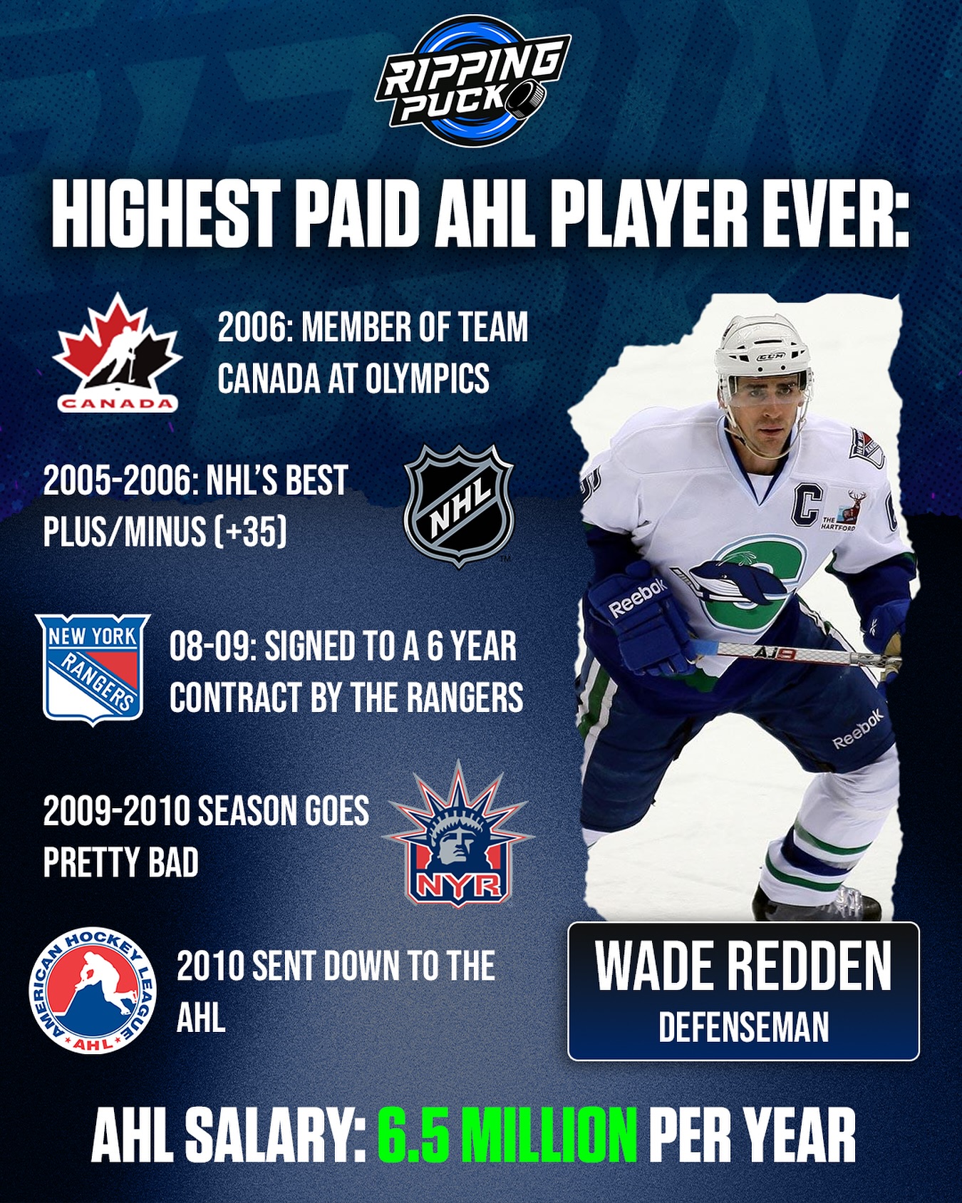 Wade Redden spent two full seasons in the AHL at 6.5 million a season #newyorkrangers #nhl