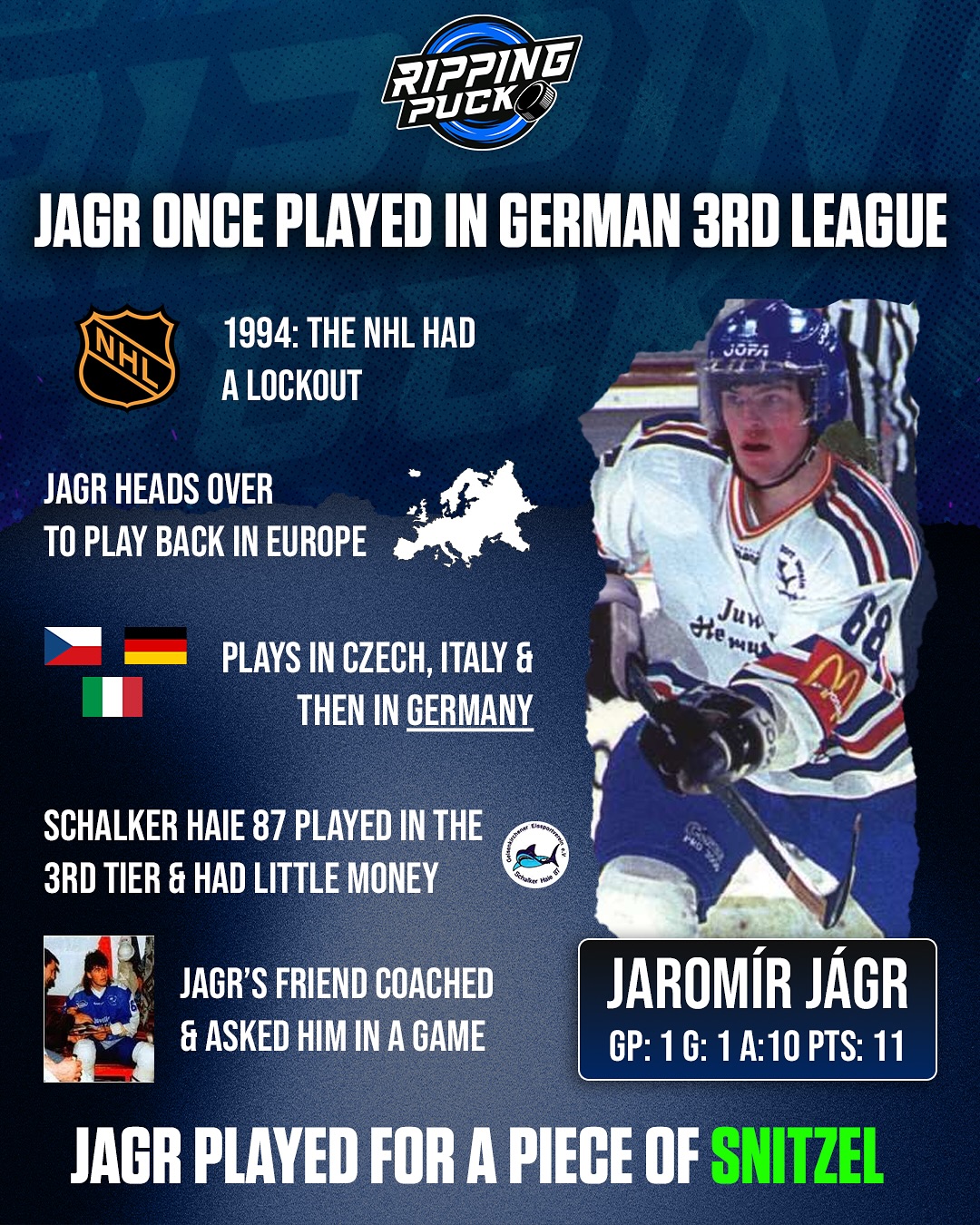 After playing in Italy with Bolzano, Jaromir Jagr’s European run during the lockout made one more stop in Germany. In January 1995, just before the NHL lockout ended, he joined his friends Petr Fiala and Vladimir Kames for a single game with the third division Schalke Sharks. The team expected to shell out thousands to host a superstar like Jagr, but he stunned them by saying he didn’t want a dime, just a meal, a drink, and a place to crash. Jagr scored once and assisted on ten more goals as Schalke crushed Herner EV 20 to 3. Afterward, he celebrated with schnitzel and beer, slept on a buddy’s couch, and headed home to Kladno. #hockey #nhl