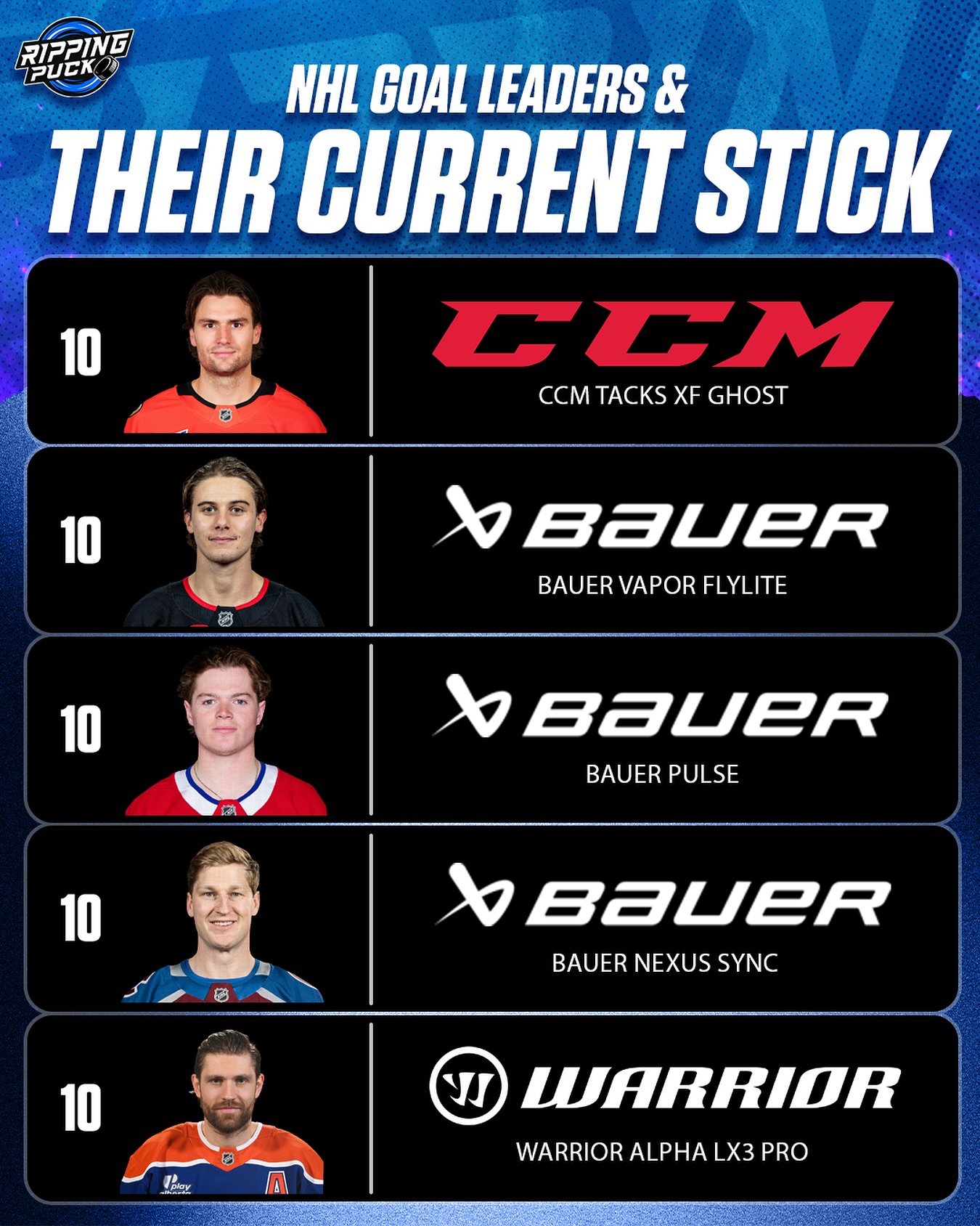 All with 10 goals to start the season, here are the sticks that the NHL’s top goal scorers are using according to @geargeekhockey #nhl #hockey